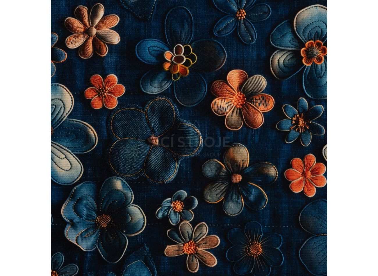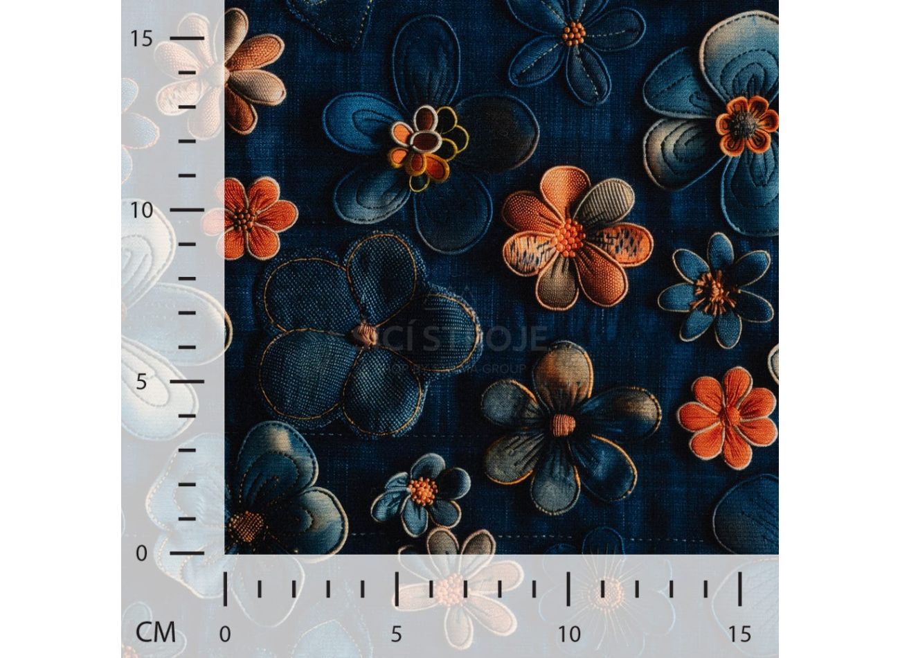 Alpenfleece Digital Print, 60% polyester, 36% bavlna, 4% elastan, minimálna šírka 145 cm, gramáž 380 g/m2, vzor flowers, farba denim