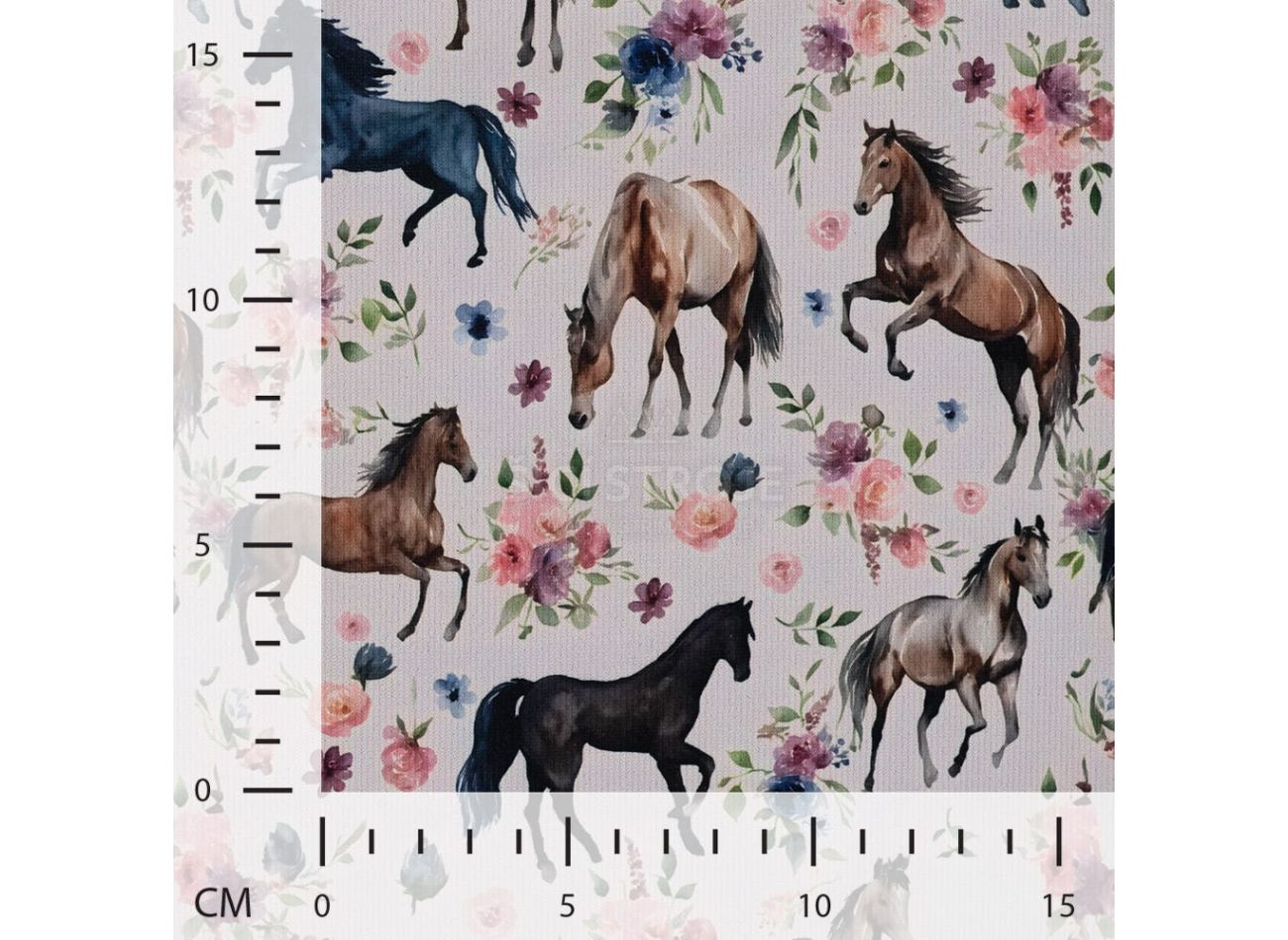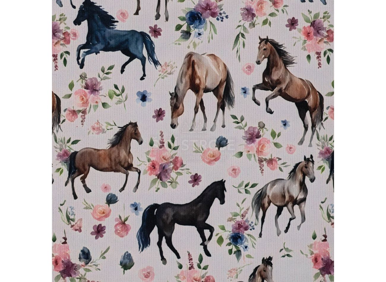 Alpenfleece Digital Print, 60% polyester, 36% bavlna, 4% elastan, minimálna šírka 145 cm, gramáž 380 g/m2, vzor horses, farba sand