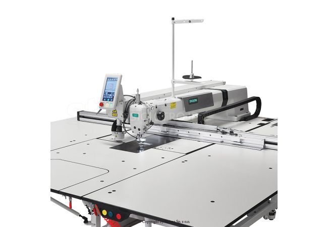 Programovateľný inteligentný elektronický automatický šijací stroj na šitie veľmi veľkých častí. Špeciálny riadiaci systém eliminuje nekorektné stehy aj pri maximálnej rýchlosti šitia. Perfektné kladenie stehu do stehu.