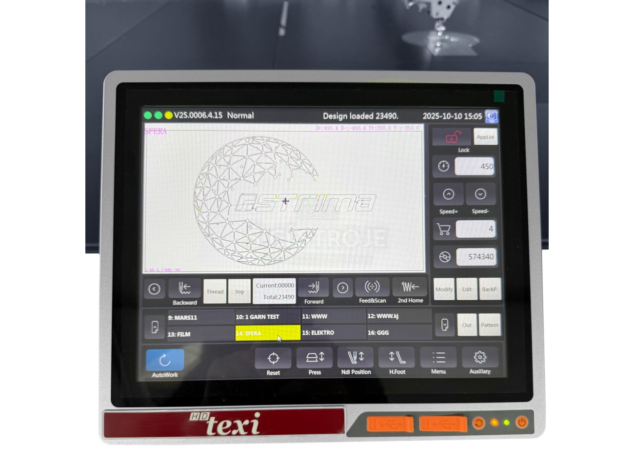 Priemyselný CNC stroj s pracovnou plochou 200 x 90 cm, určený na sériové šitie opakovateľných vzorov s najvyššou presnosťou. Jedná sa o stroj s viazaným stehom s priamym servopohonom a technológiou suchej hlavy, ktorá eliminuje riziko olejových škvŕn. Veľký 15" LCD dotykový panel umožňuje rýchlo upravovať a ukladať vzory a pokročilé automatické funkcie zaisťujú efektivitu, opakovateľnosť a najvyššiu kvalitu stehu. Stroj je pokročilým riešením pre výrobcov, ktorí hľadajú opakovateľnosť, presnosť a vysokú kvalitu švov. Vďaka veľkému chapaču, automatickým funkciám a intuitívnemu ovládaniu zaručuje efektivitu a redukciu chýb.