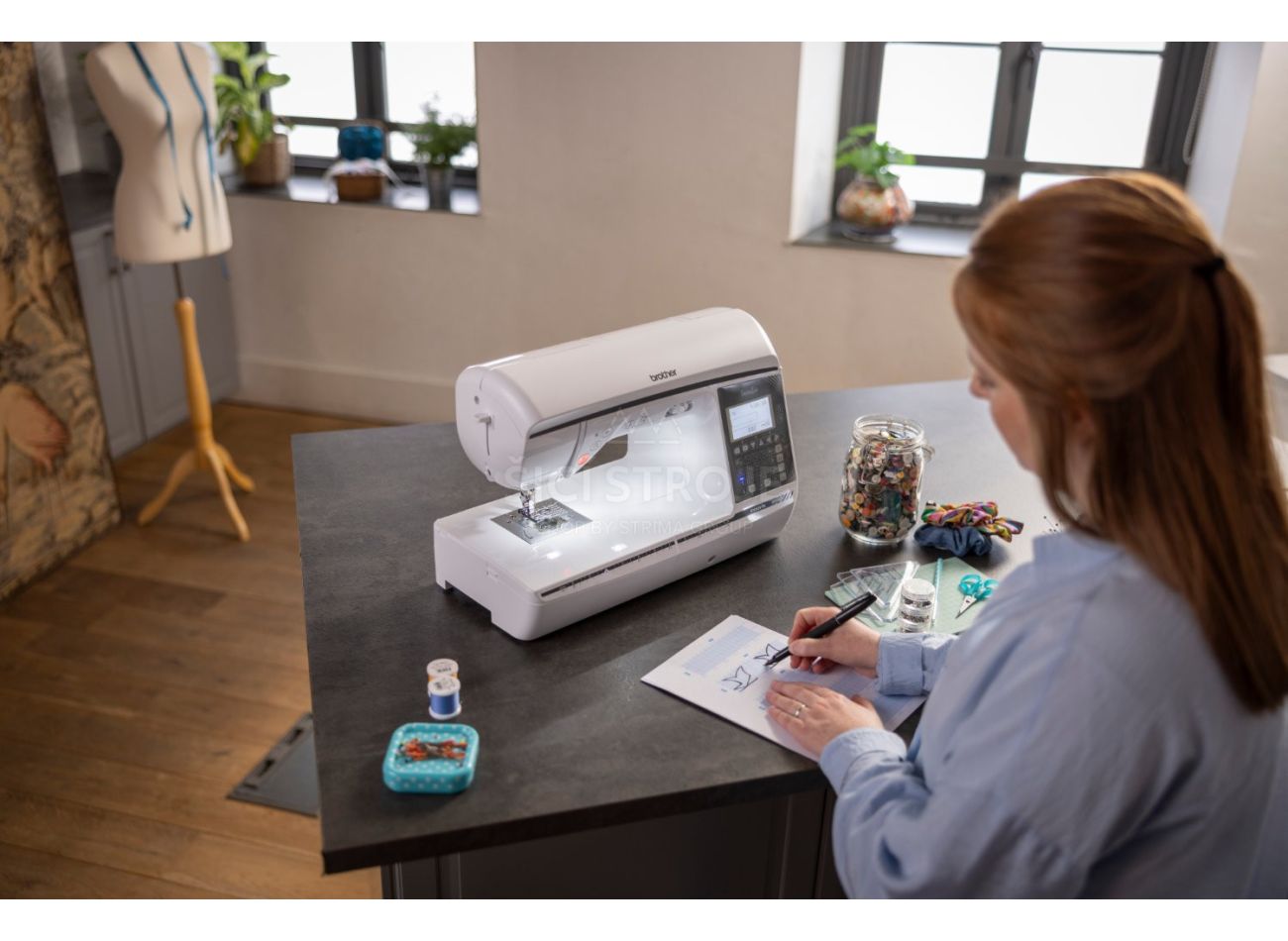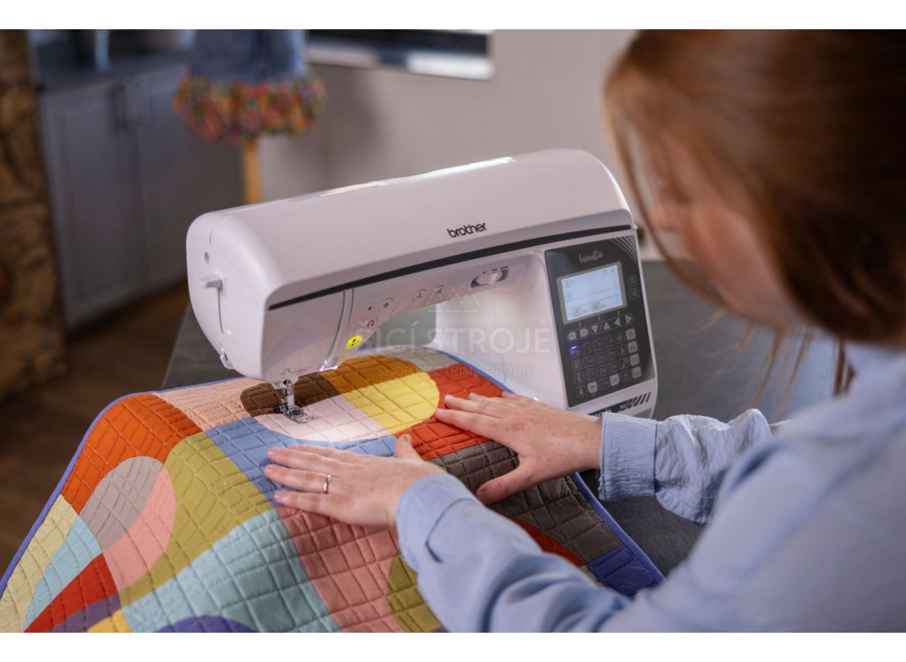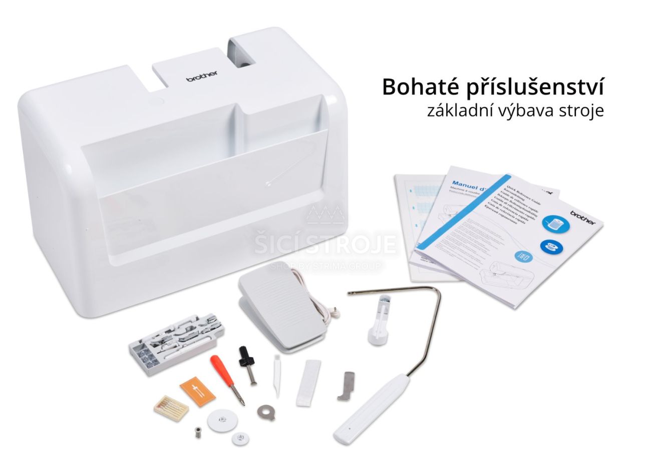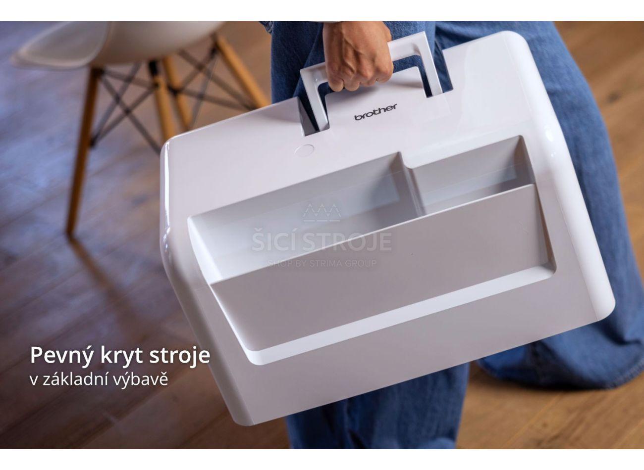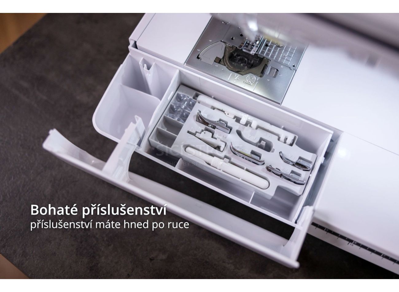 Samozrejmosťou je voľné rameno na šitie nohavíc a rukávov, robustné celokovové telo stroja, ergonomicky umiestnené tlačidlá, možnosť ponorenia podávača pod stehovú dosku pri látaní a quiltovaní, LED osvetlenie, rýchla výmena pätiek jednoduchým nacvaknutím. Brother používa moderné tiché rotačné chapače, ktoré sa jednoducho čistia, niť nasadíte behom okamihu a počas šitia priehľadnou krytkou vidíte, koľko nite vám zostáva na cievke. V priehradke na príslušenstvo nájdete praktický zakladač na pätky, takže máte všetko pripravené.