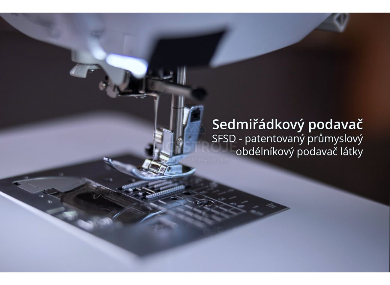 S vysokými a silnými látkami si hravo poradí - je totiž vybavený patentovaným obdĺžnikovým podávačom SFDS (Square Feed Drive System), s elektronickou reguláciou prítlaku pätky a šijacou pätkou s fixáciou polohy.