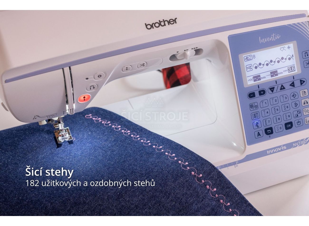 Šijací stroj Brother NV1350 ponúka 182 druhov stehov vr. overlockových a dekoračných s možnosťou tvorby stehov vlastných, 10 typov automatické gombíkové dierky šité na 1 krok.