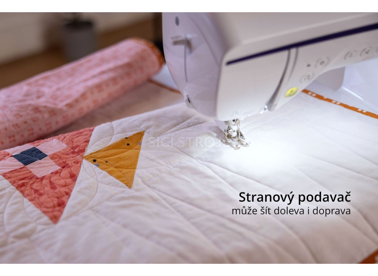 Oproti nižšiemu modelu má stranový podávač - zúbky podávača vedia podávať nielen dopredu a dozadu, ale tiež vľavo a vpravo. Vľavo a vpravo vie šiť ako rovný steh, tak cik-cak, takže na voľné rameno navlečiete nohavicu a ušijete štvorček. Dokonalé na prišívanie záplat - už nebudete musieť párať nohavicu! Stranové podávanie používa aj na šitie ozdobných stehov, ktoré sú až 40 mm široké a písmenká abecedy má tiež väčšie, než nižšie modely - sú až 12 mm vysoké.
