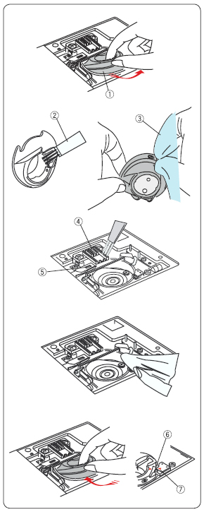 Čistenie člnkovej dráhy a podávača u šijacieho stroja s rotačným chapačom