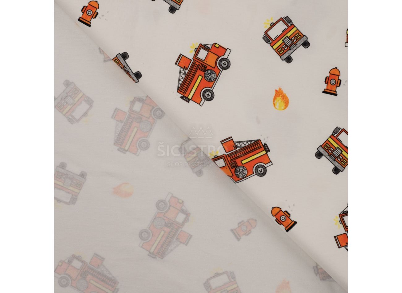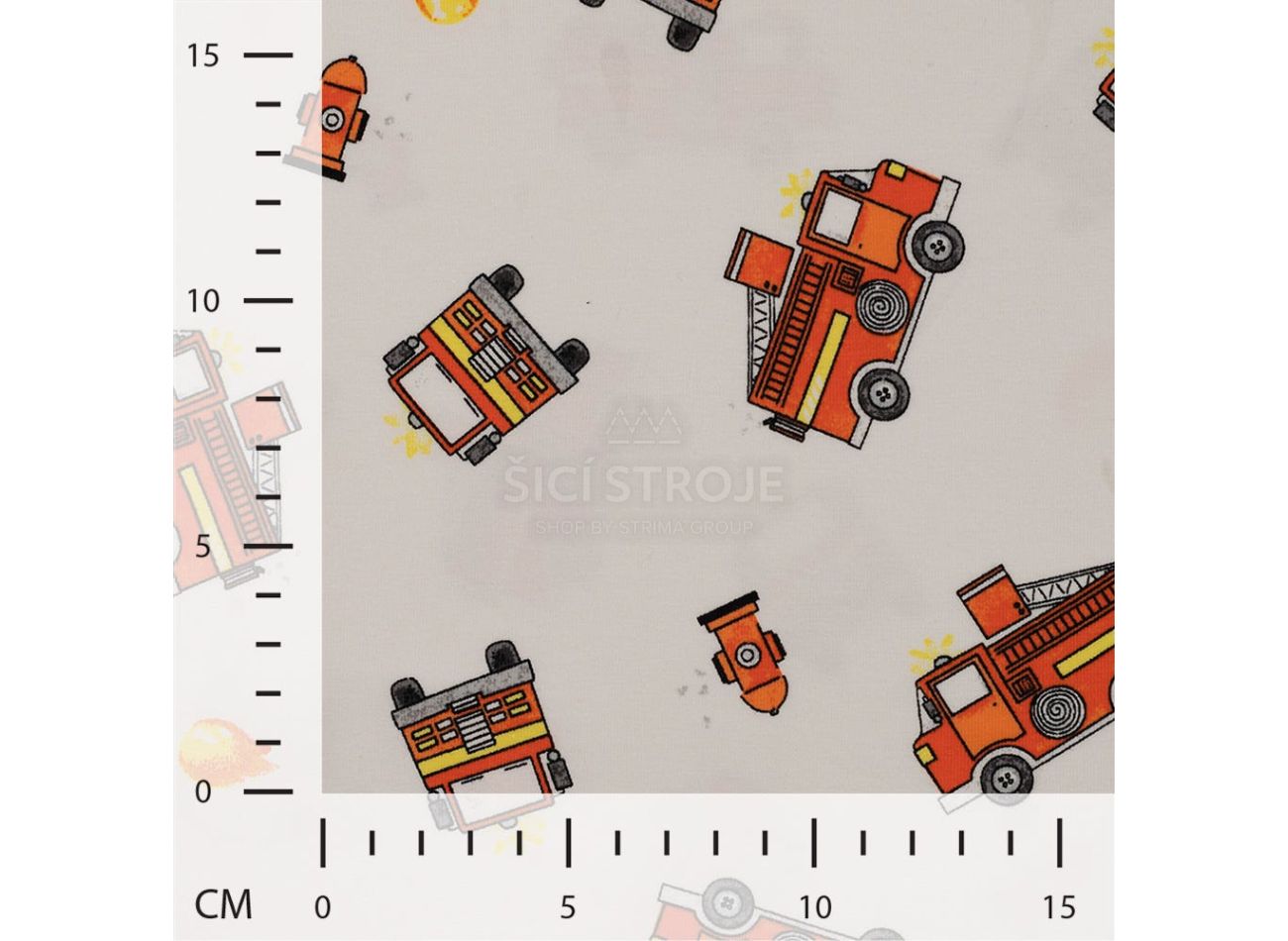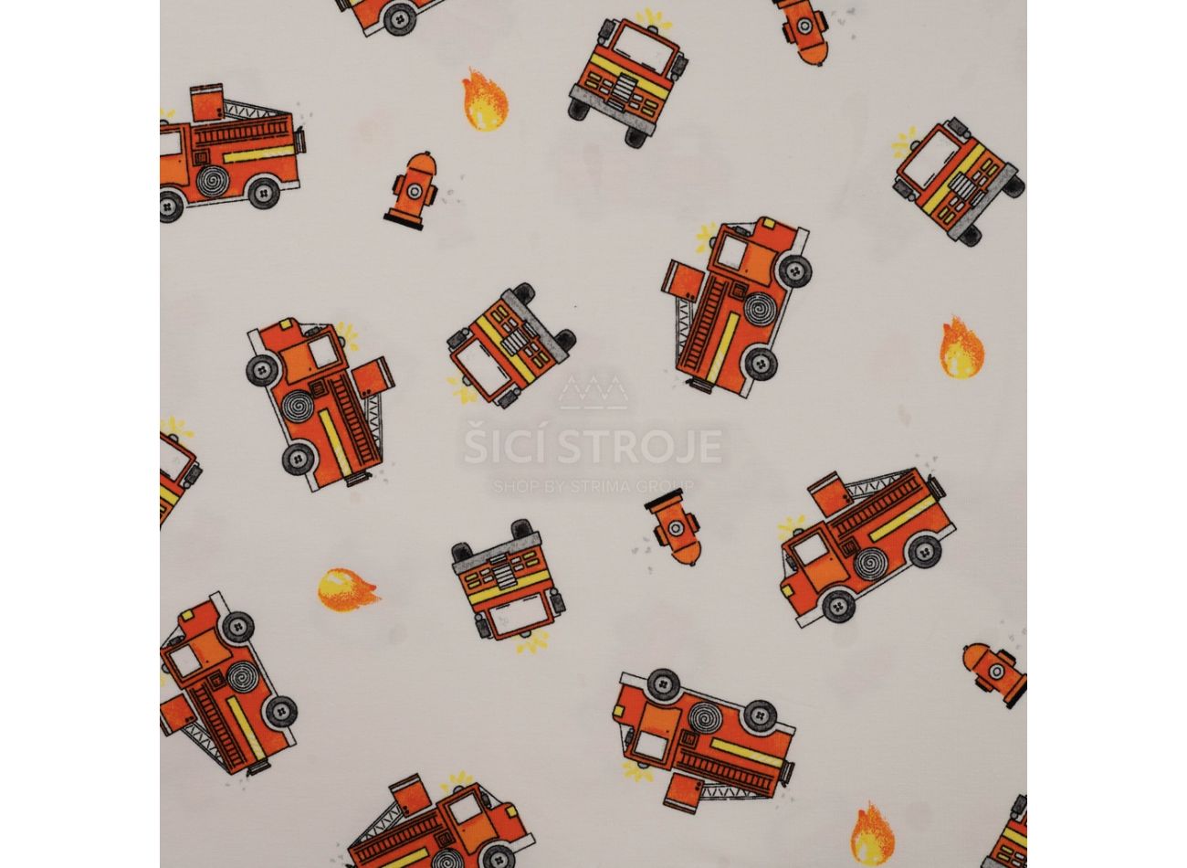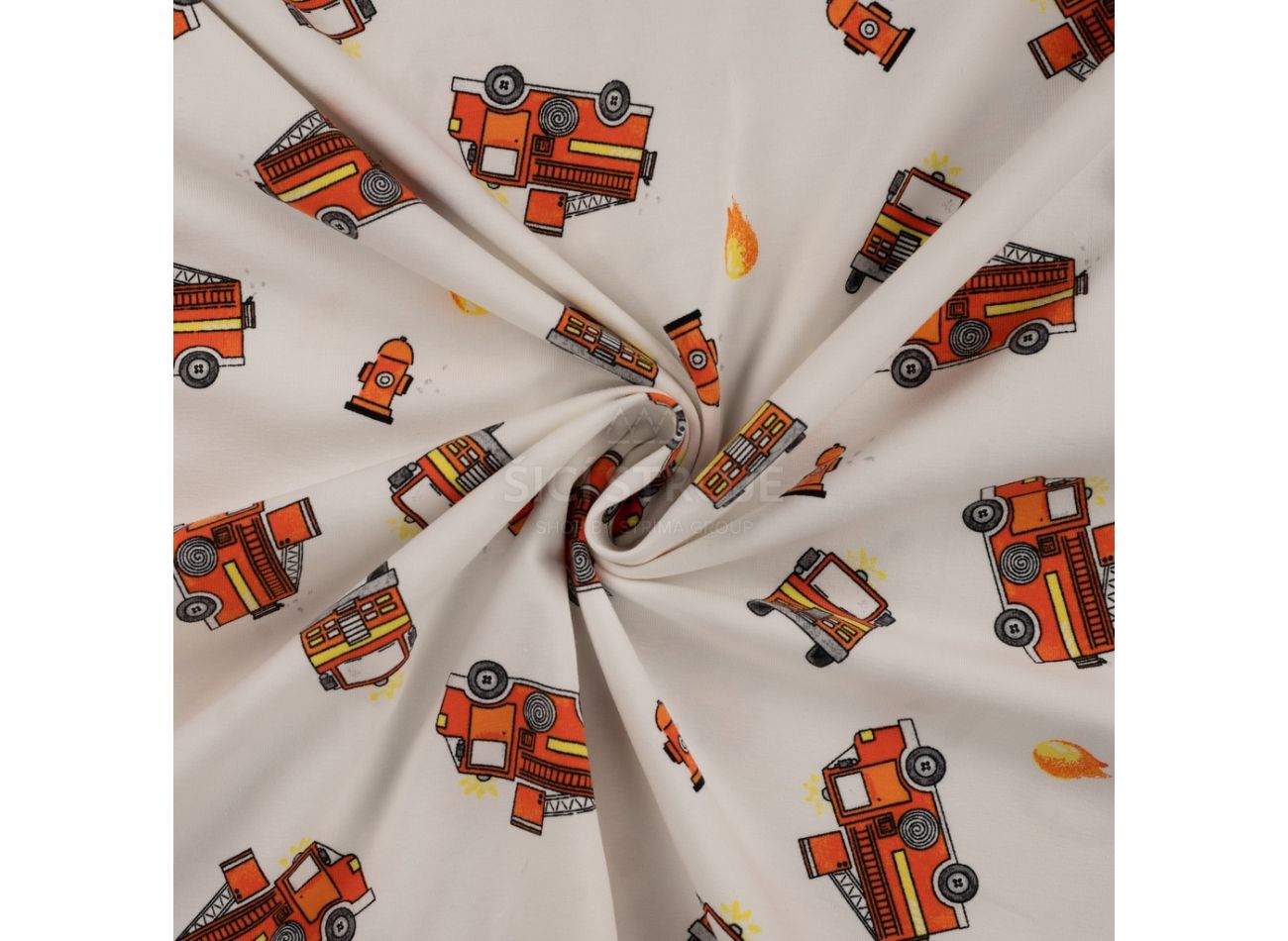 Cotton/EA Jersey, 95% bavlna, 5% elastan, minimálna šírka 145 cm, gramáž 200 g/m2, vzor fire trucks, farba off white