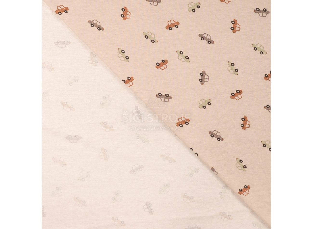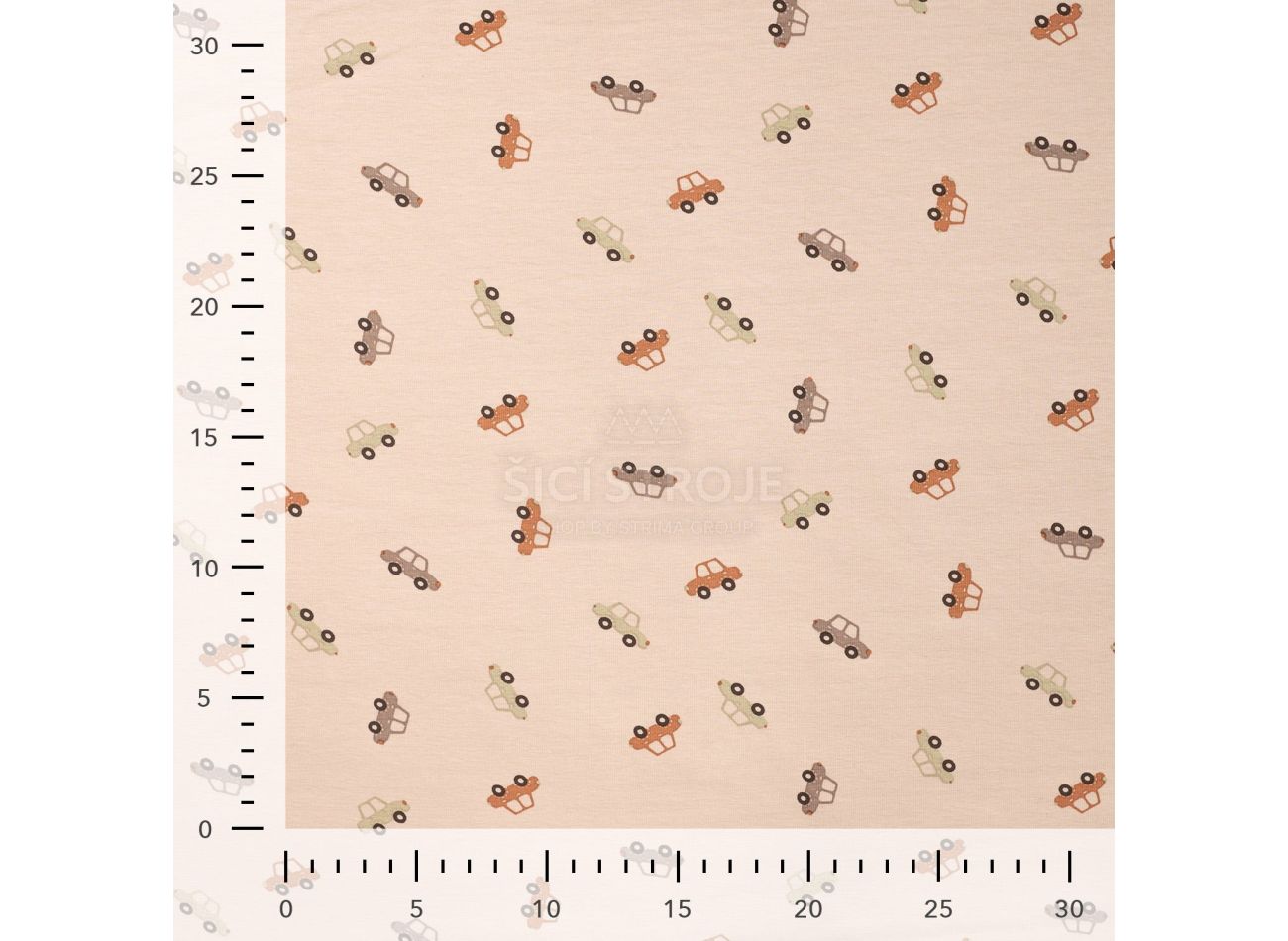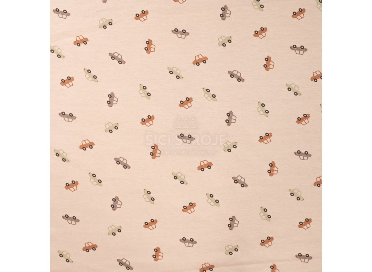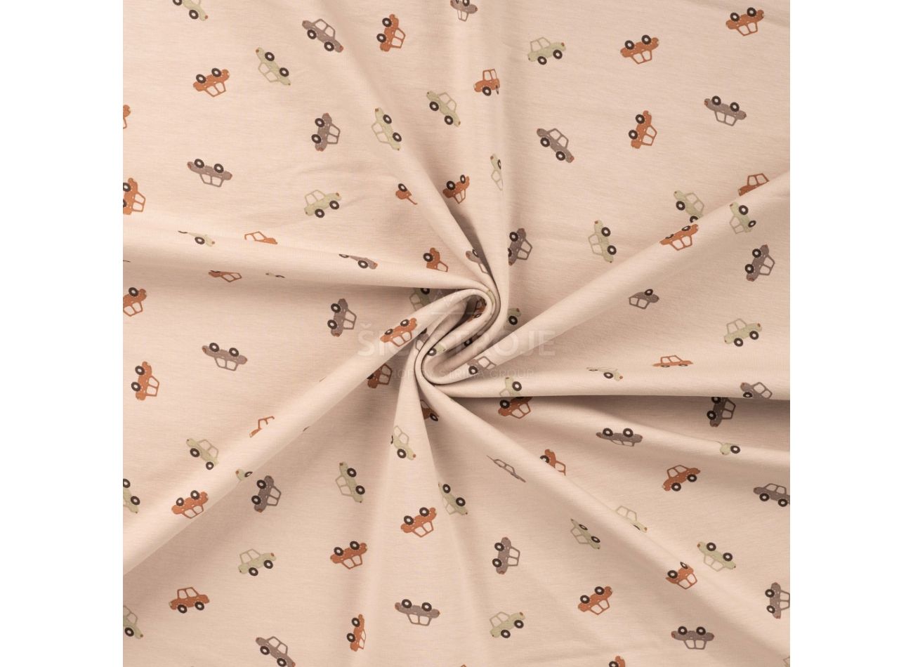 Cotton/EA Jersey Print, 95% bavlna, 5% elastan, minimálna šírka 145 cm, gramáž 200 g/m2, vzor cars, farba sand