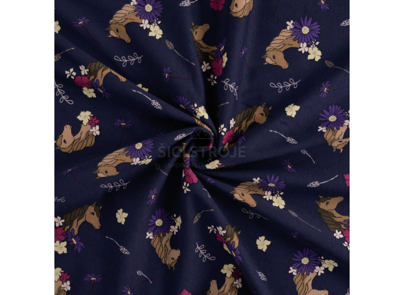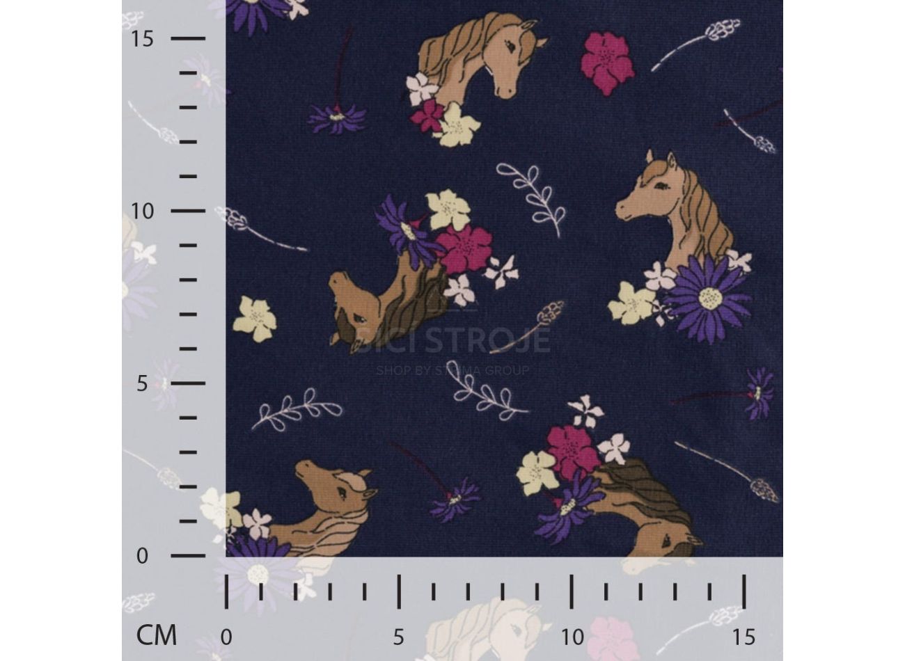Cotton/EA Jersey Print, 95% bavlna, 5% elastan, minimálna šírka 145 cm, gramáž 200 g/m2, vzor horses, farba navy