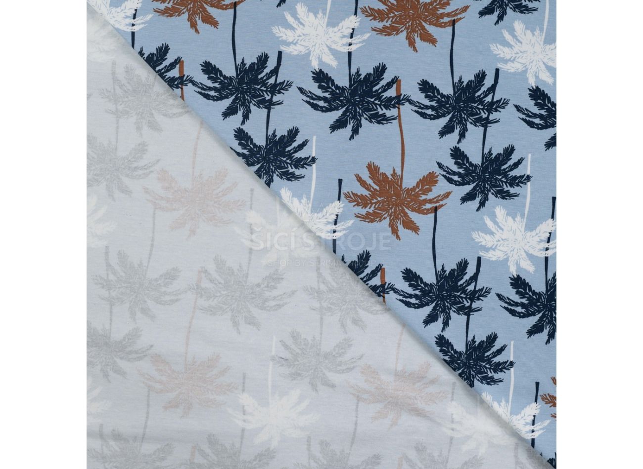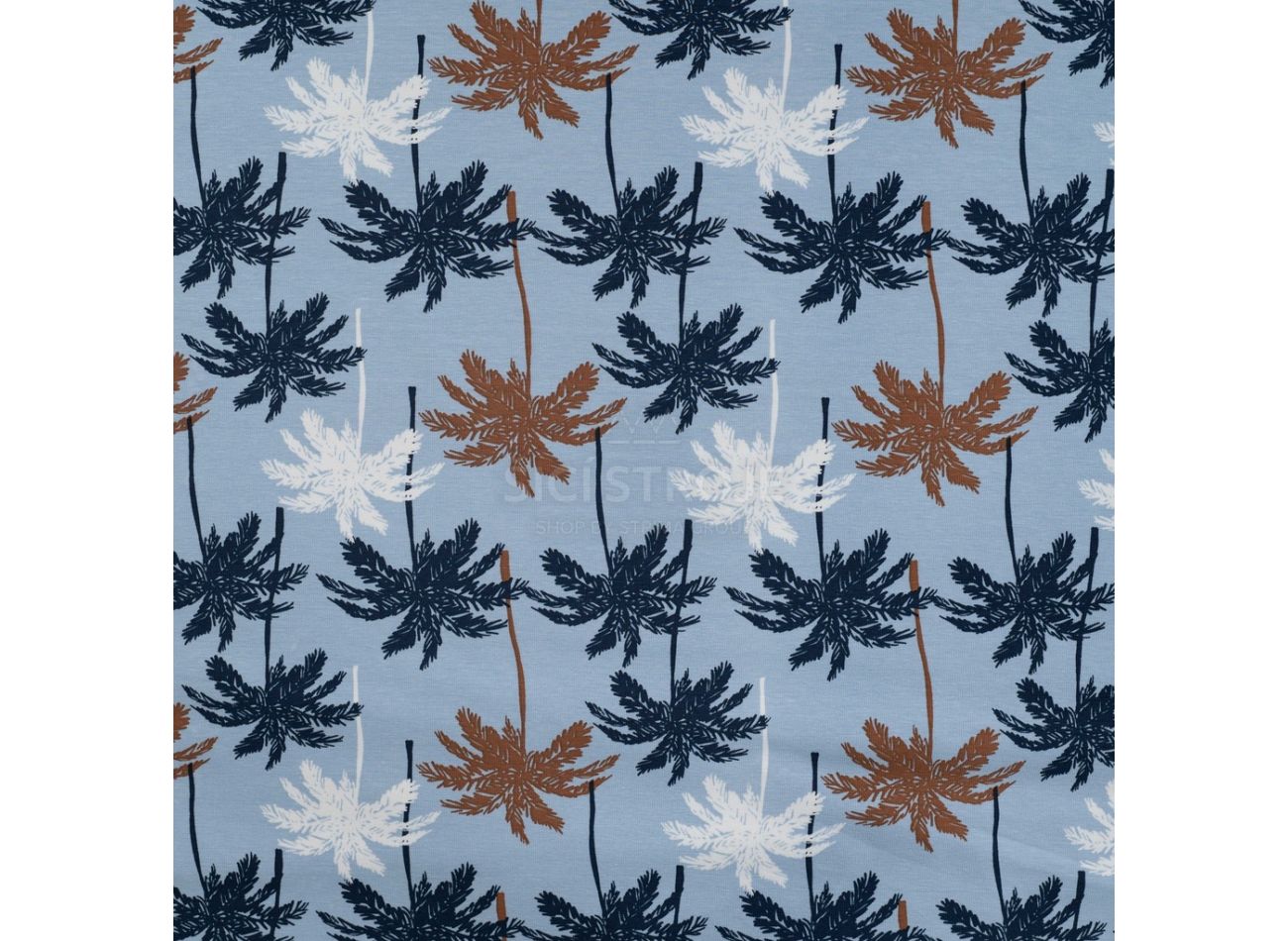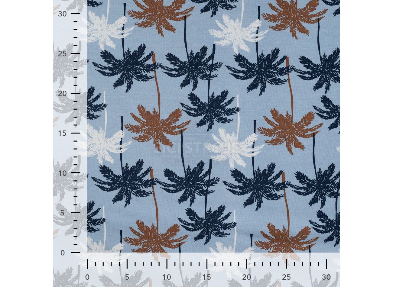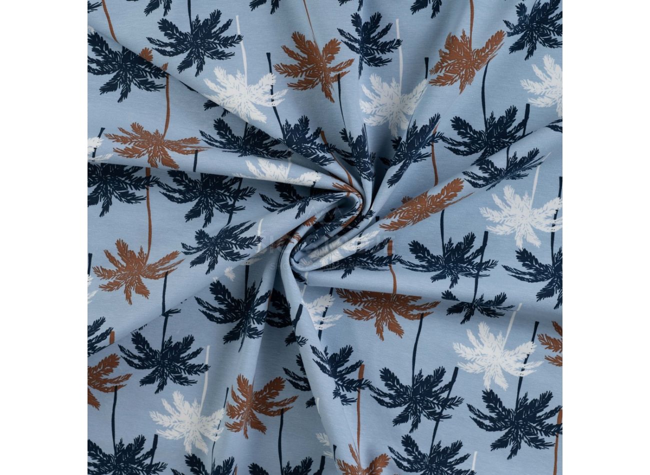Cotton/EA Jersey Print, 95% bavlna, 5% elastan, minimálna šírka 145 cm, gramáž 200 g/m2, vzor palm, farba baby blue