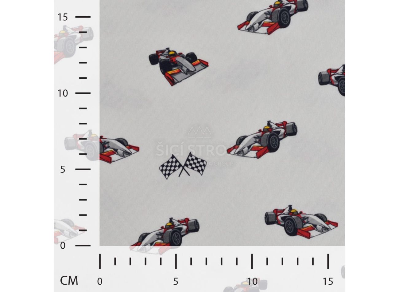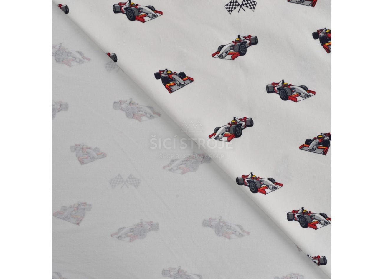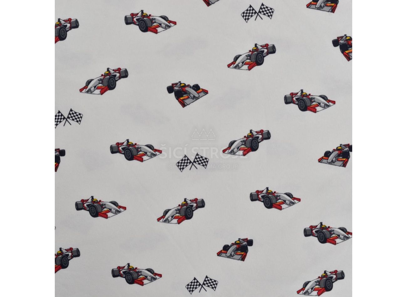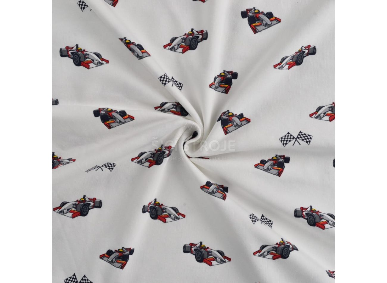 Cotton/EA Jersey Print, 95% bavlna, 5% elastan, minimálna šírka 145 cm, gramáž 200 g/m2, vzor race cars, farba off white