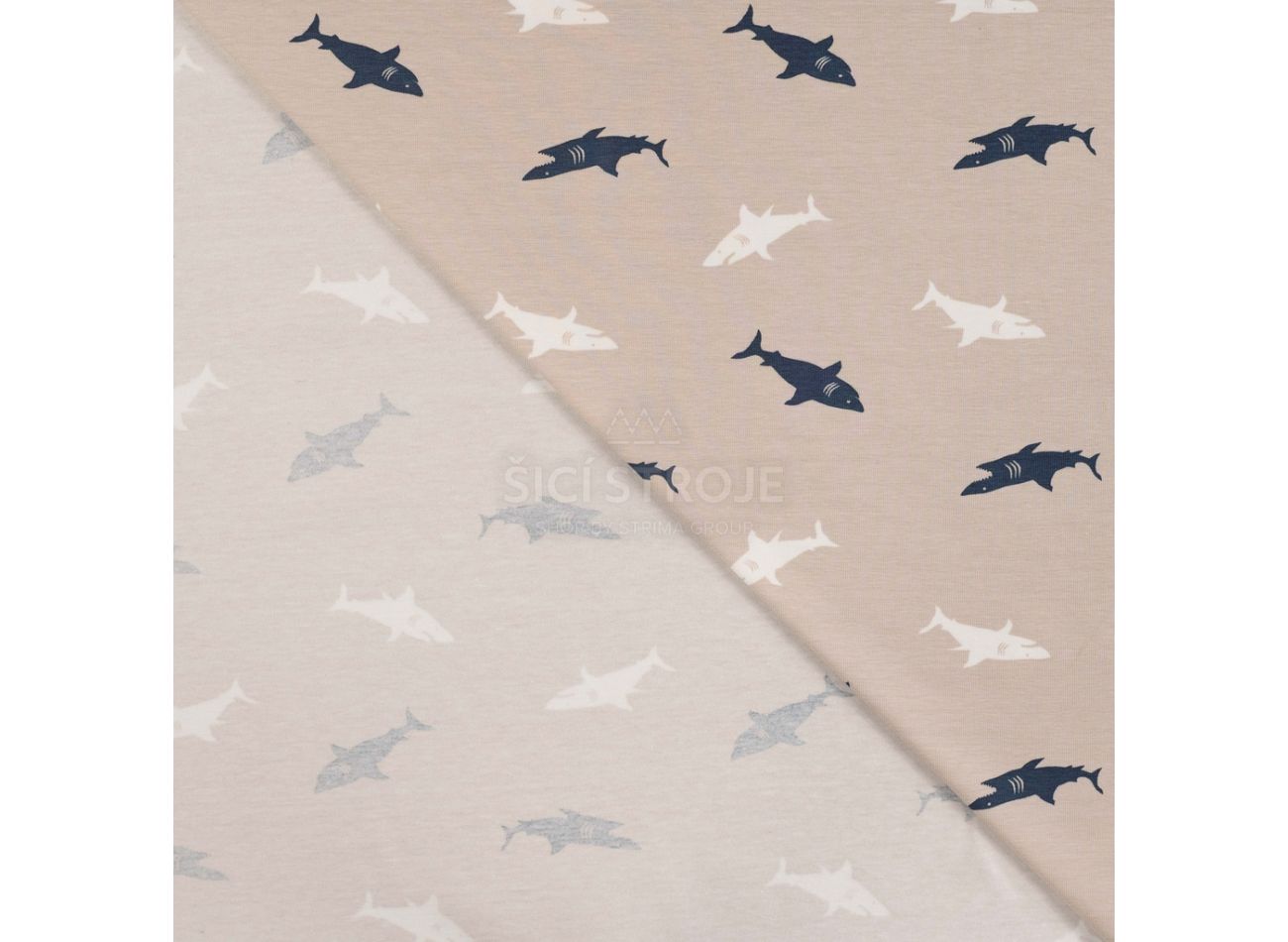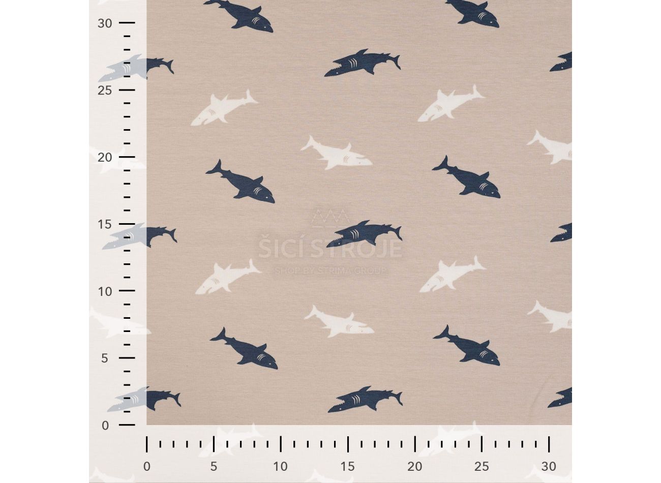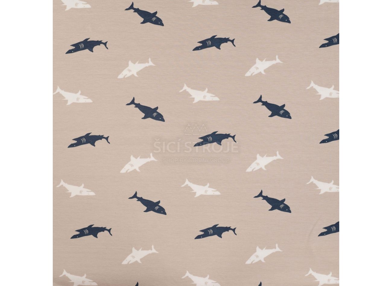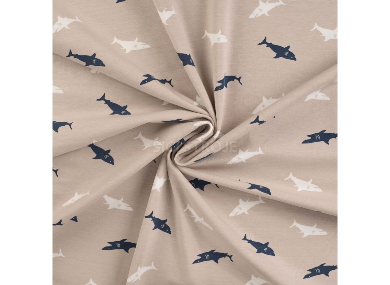 Cotton/EA Jersey Print, 95% bavlna, 5% elastan, minimálna šírka 145 cm, gramáž 200 g/m2, vzor sharks, farba sand