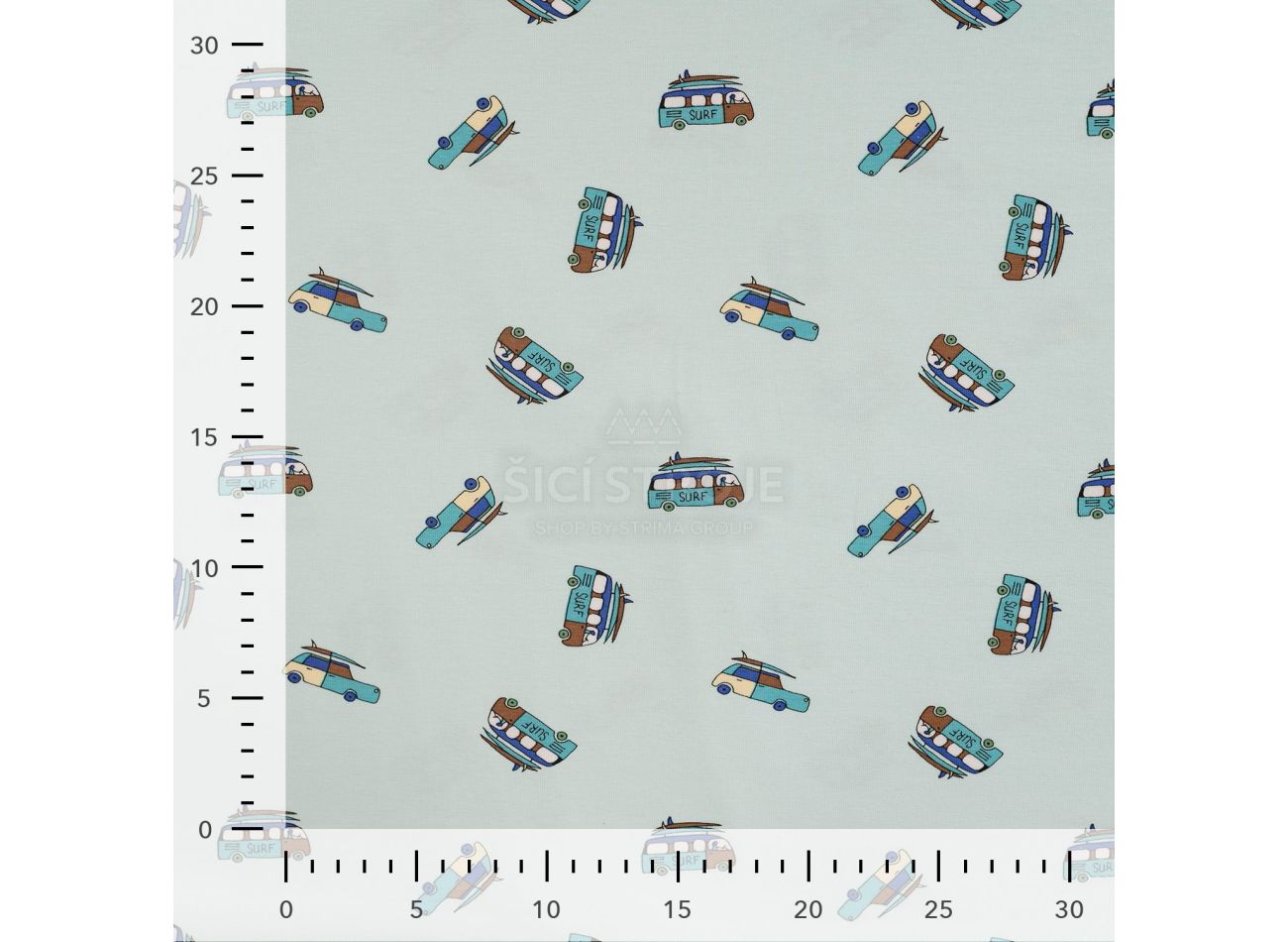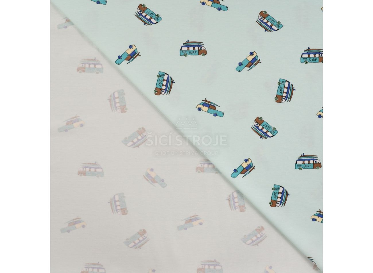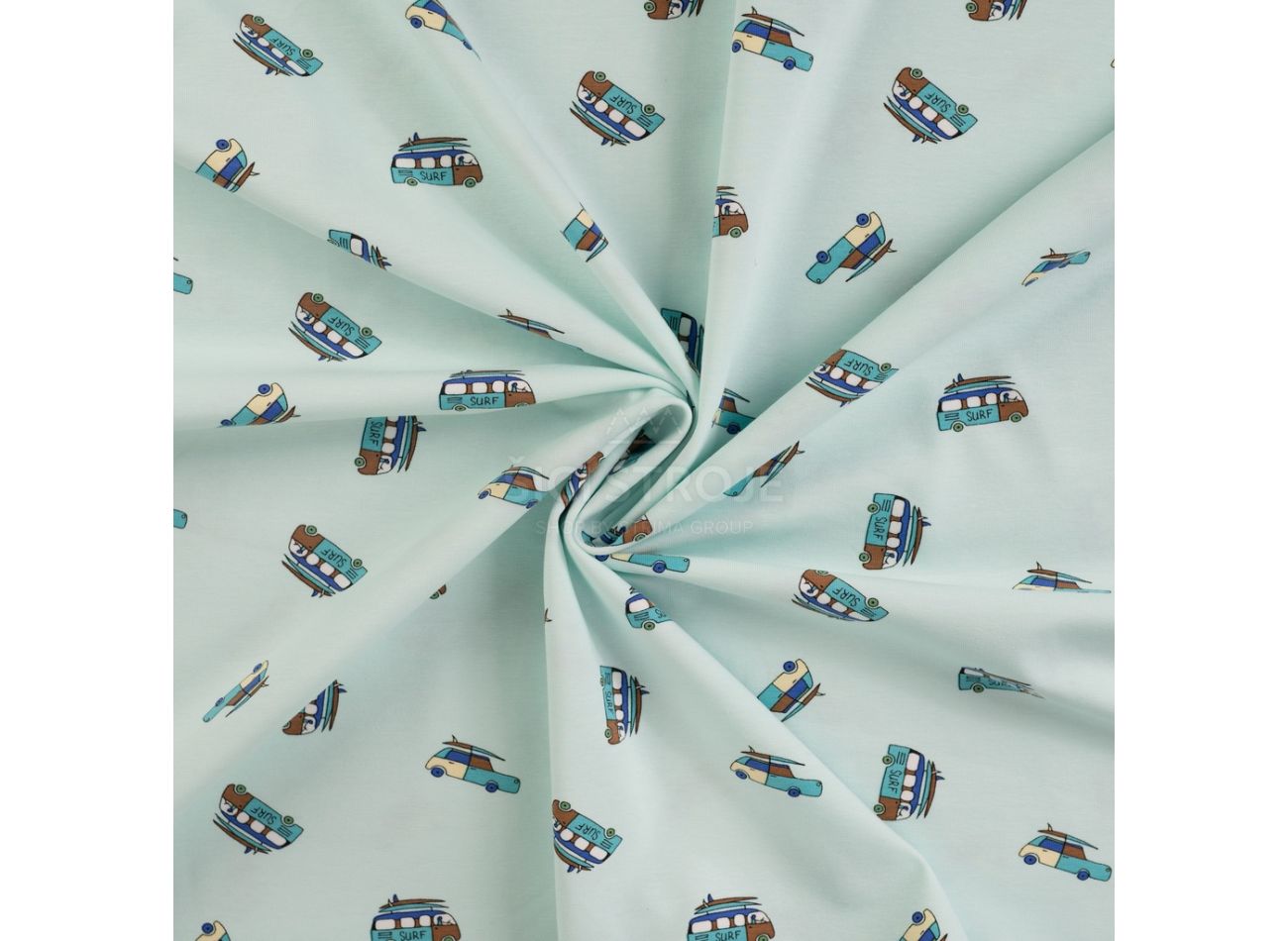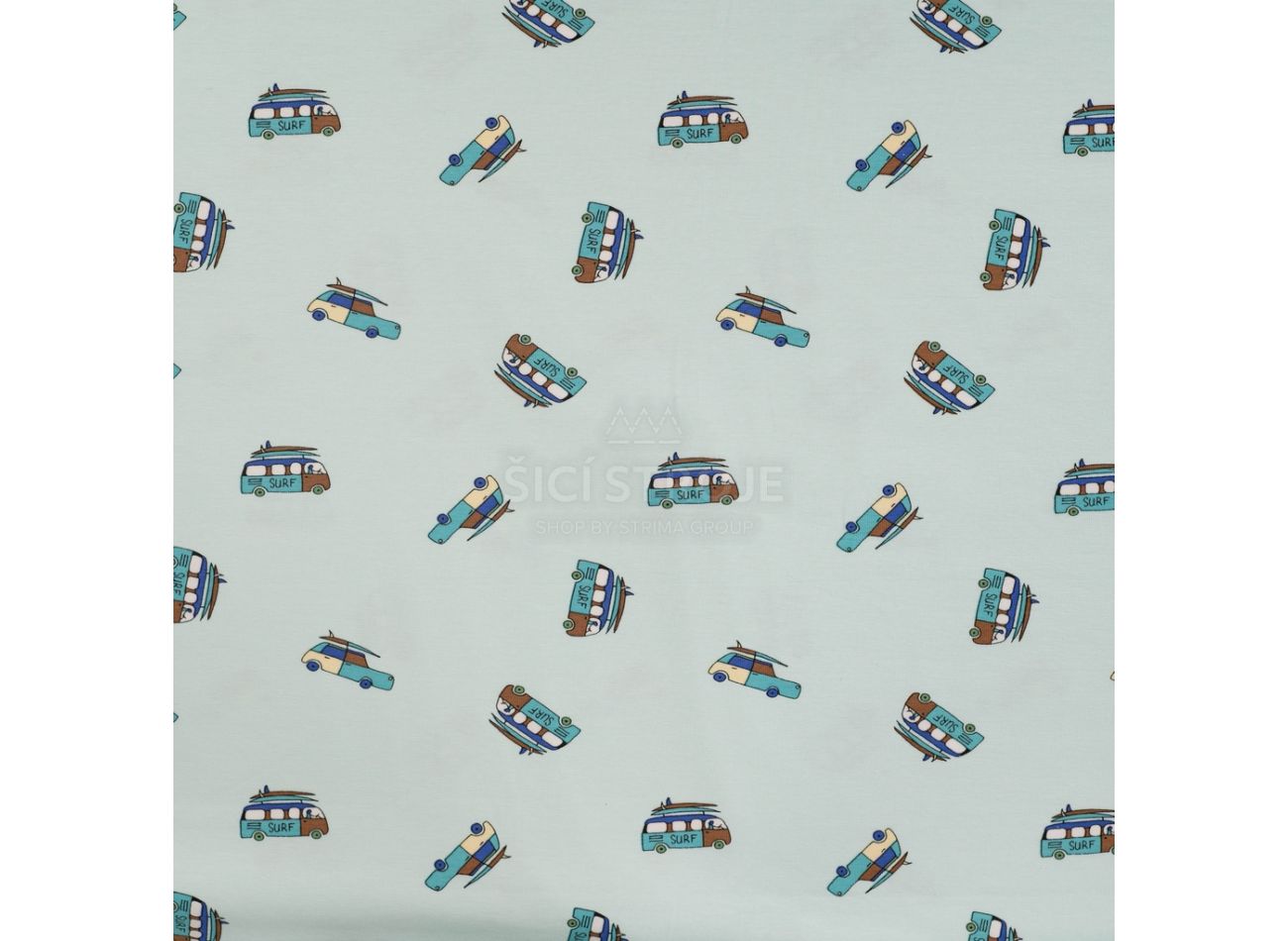 Cotton/EA Jersey Print, 95% bavlna, 5% elastan, minimálna šírka 145 cm, gramáž 200 g/m2, vzor surf van, farba baby blue