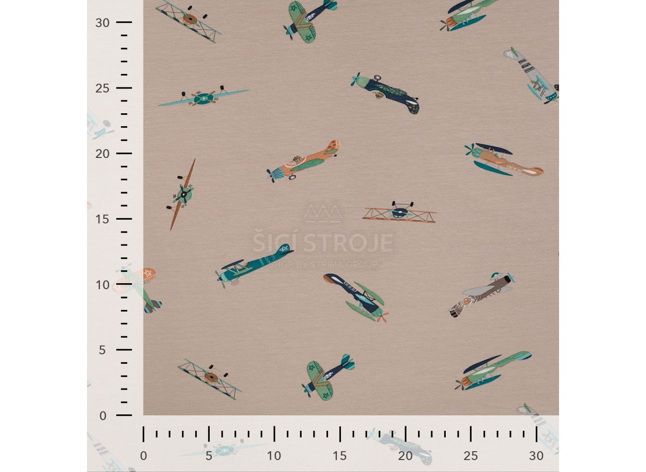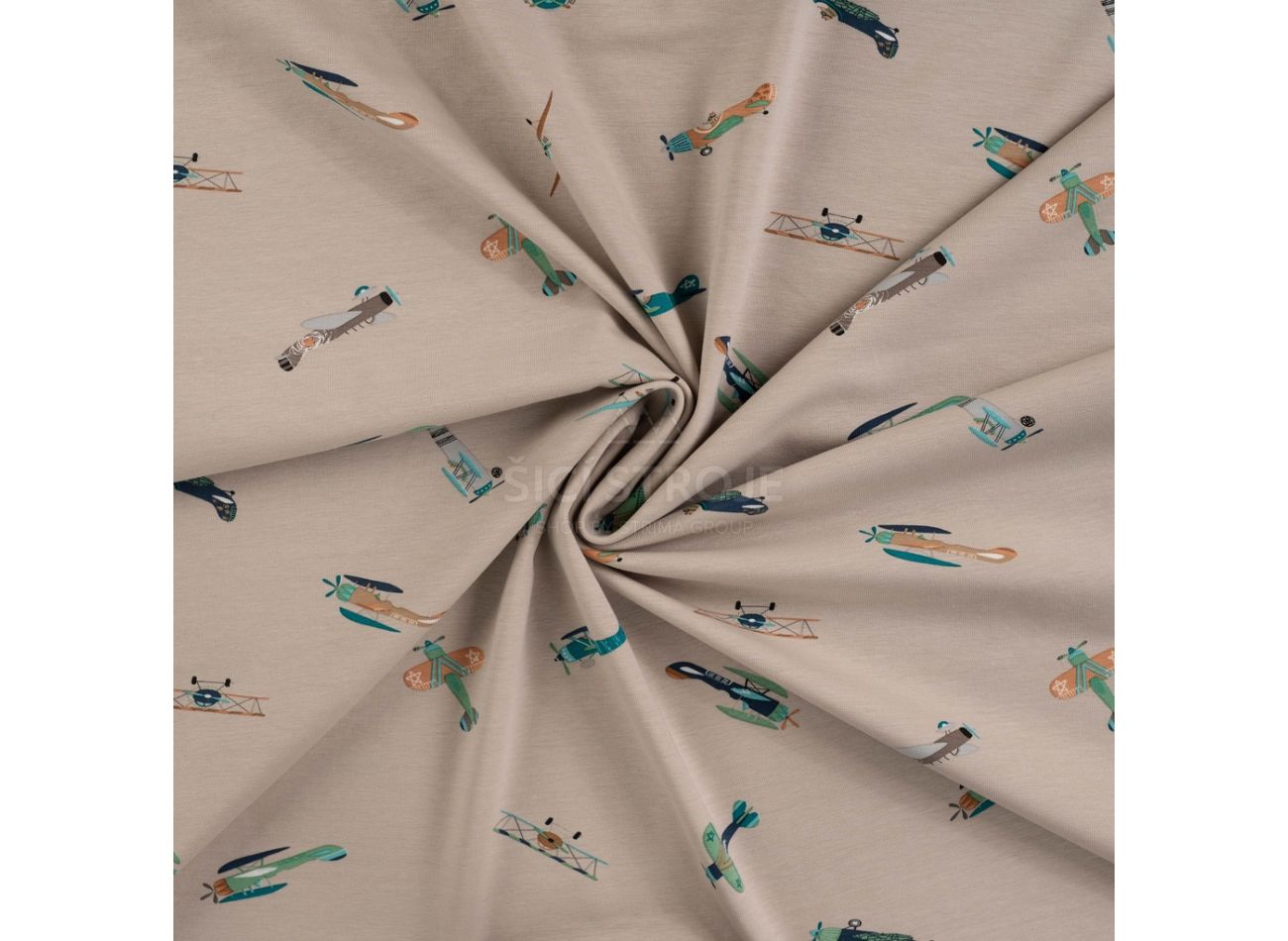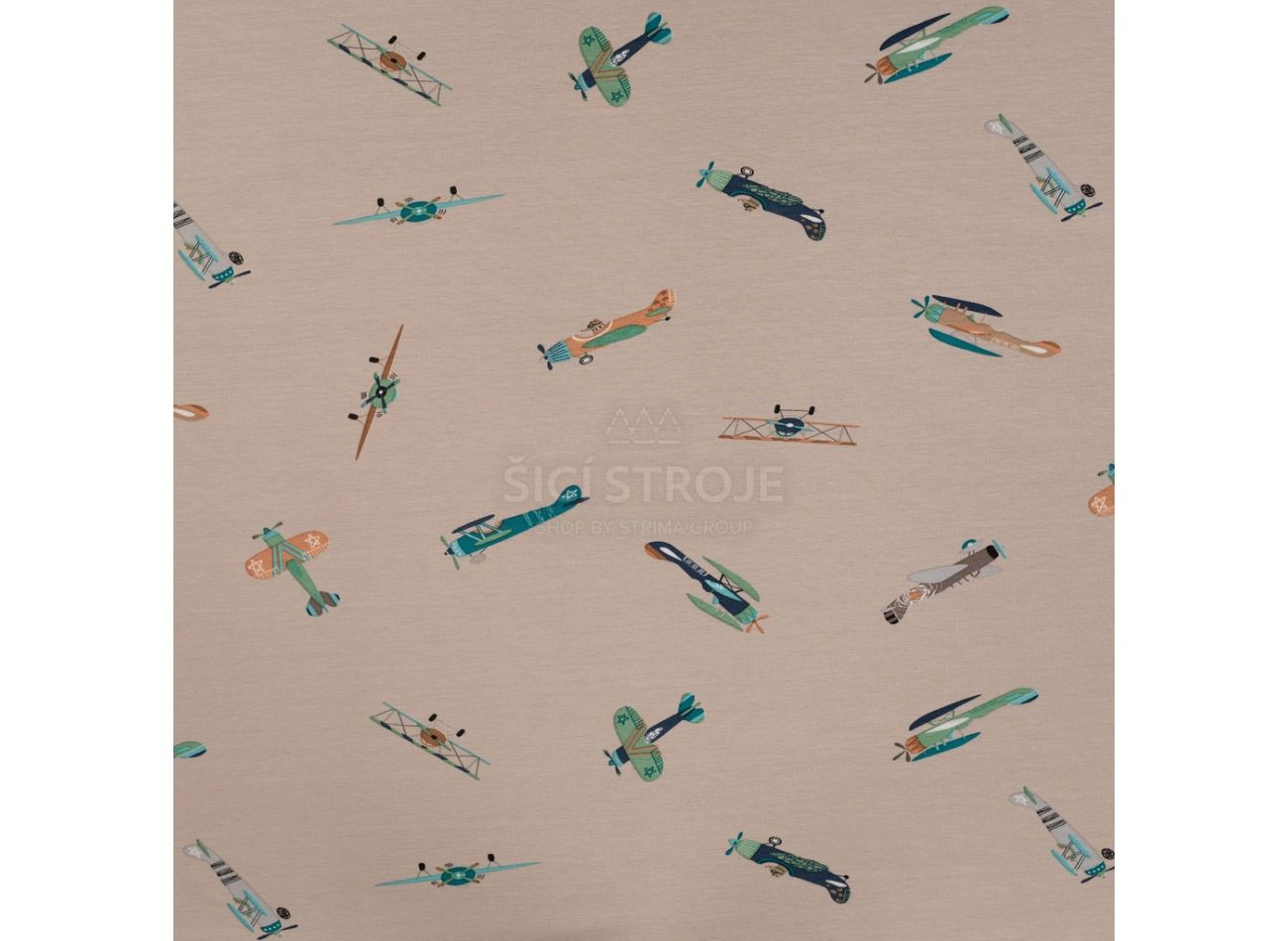 Cotton/EA Jersey Print, 95% bavlna, 5% elastan, minimálna šírka 145 cm, gramáž 200 g/m2, vzor vintage airplanes, farba sand