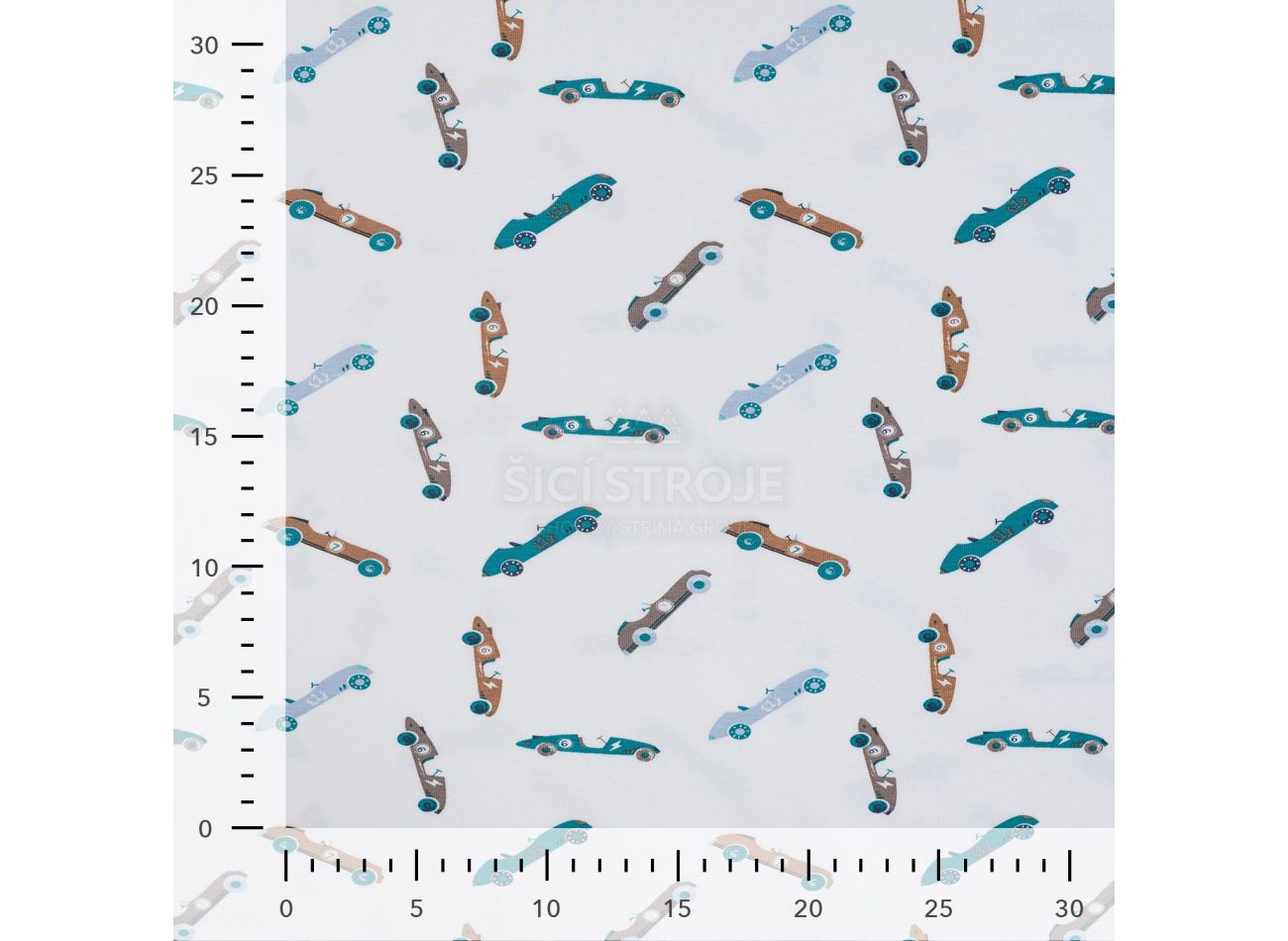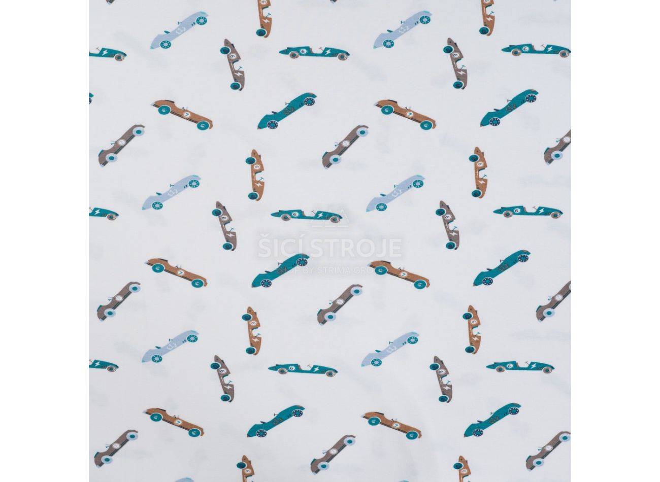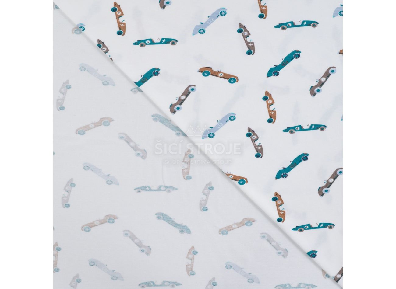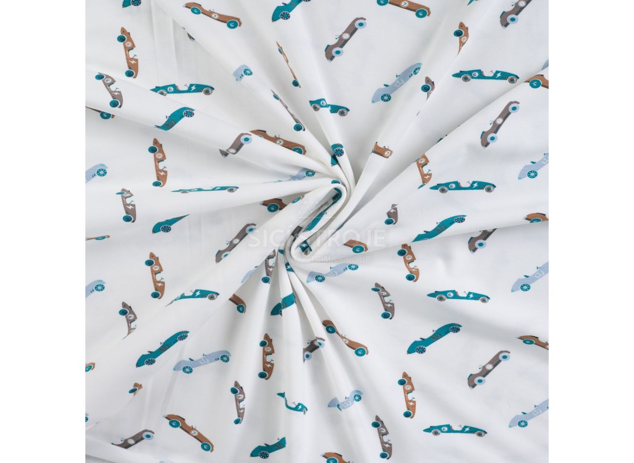 Cotton/EA Jersey Print, 95% bavlna, 5% elastan, minimálna šírka 145 cm, gramáž 200 g/m2, vzor vintage race cars, farba off white