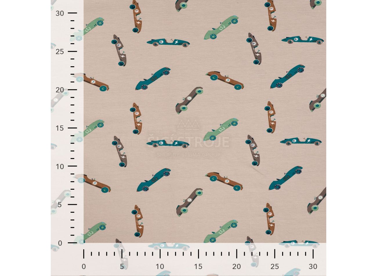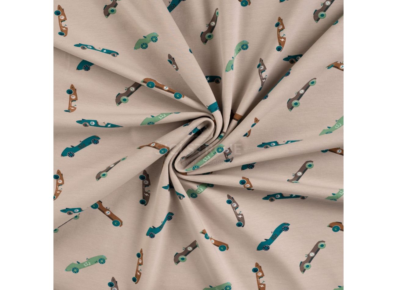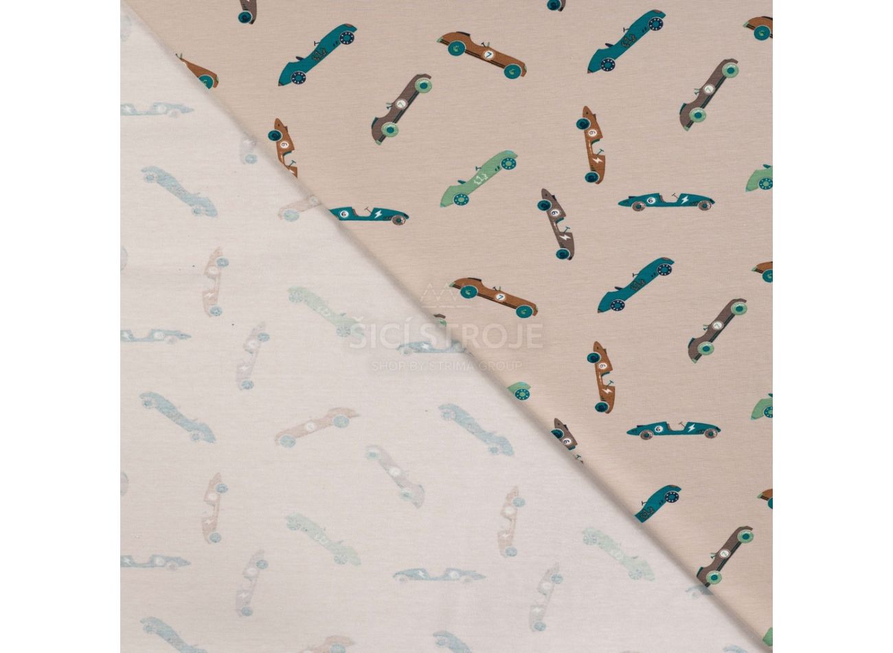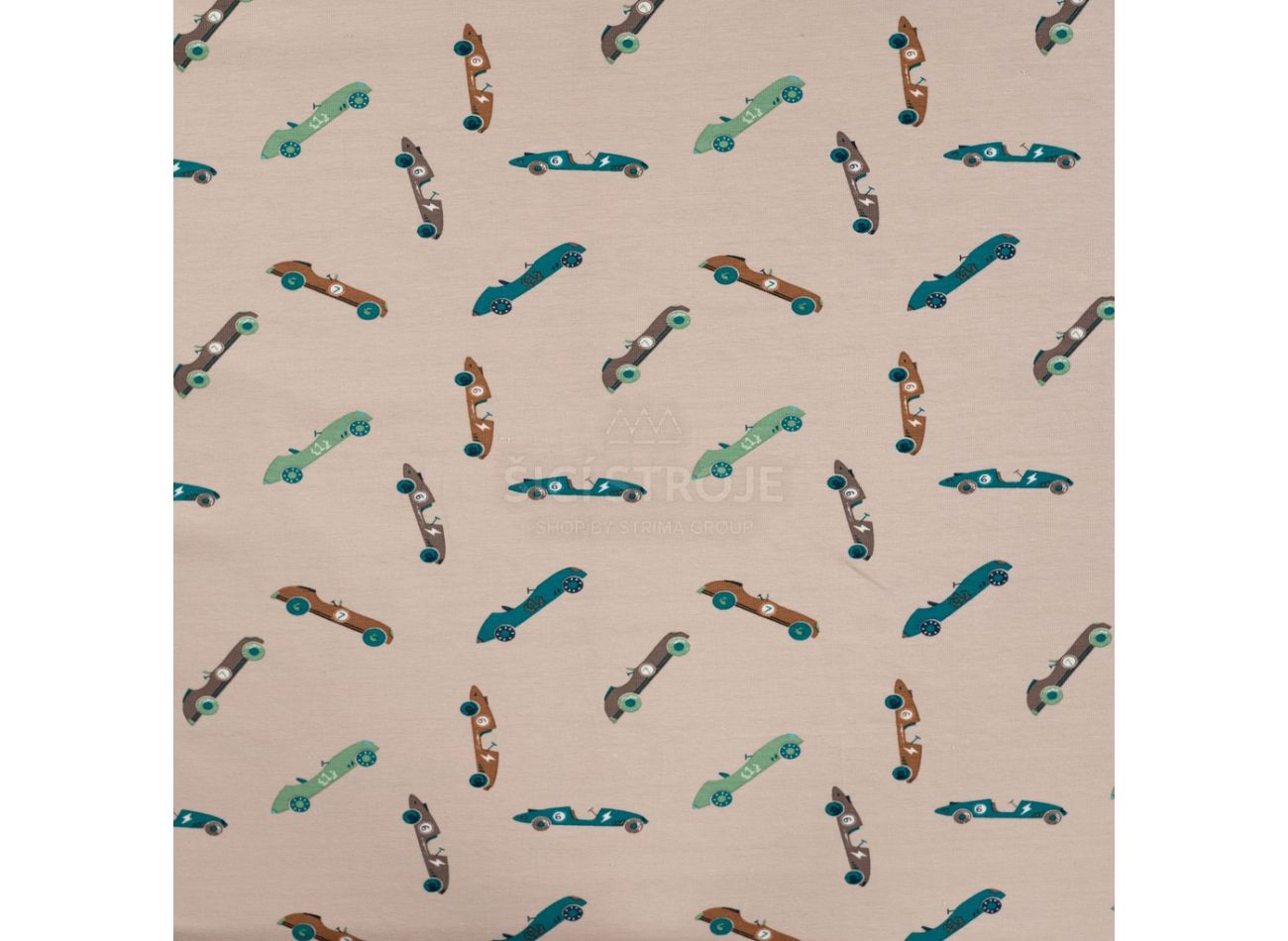 Cotton/EA Jersey Print, 95% bavlna, 5% elastan, minimálna šírka 145 cm, gramáž 200 g/m2, vzor vintage race cars, farba sand