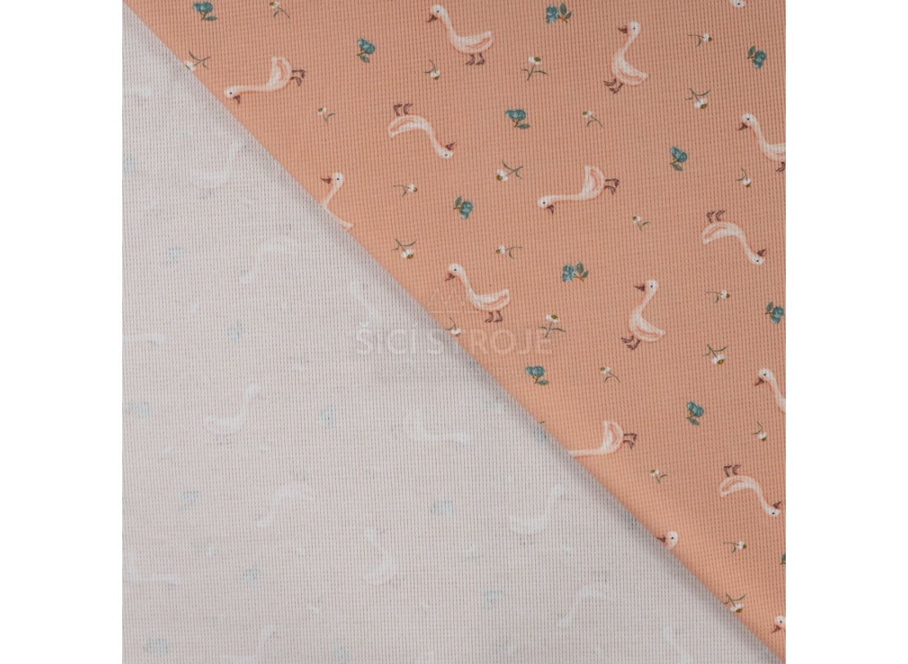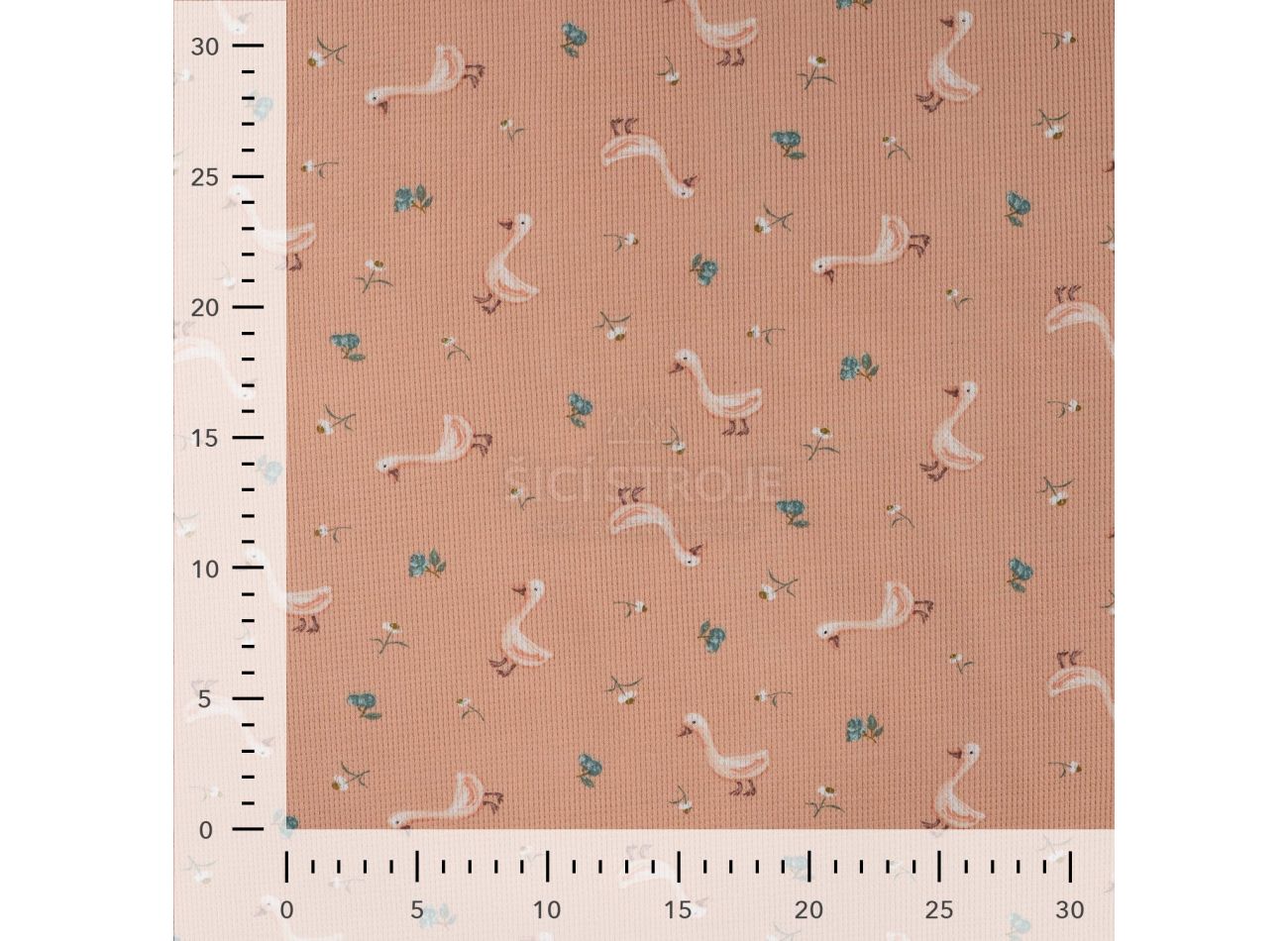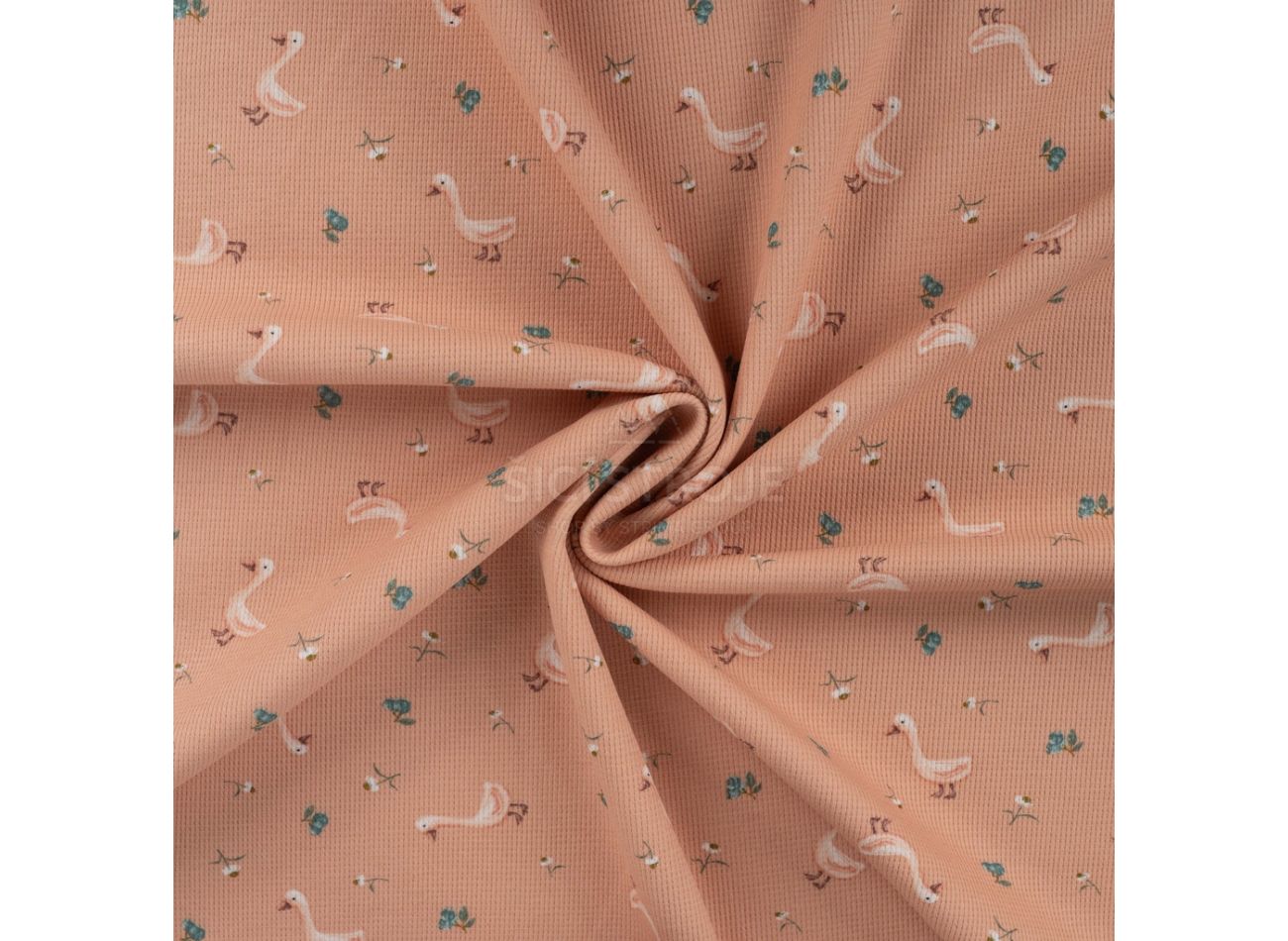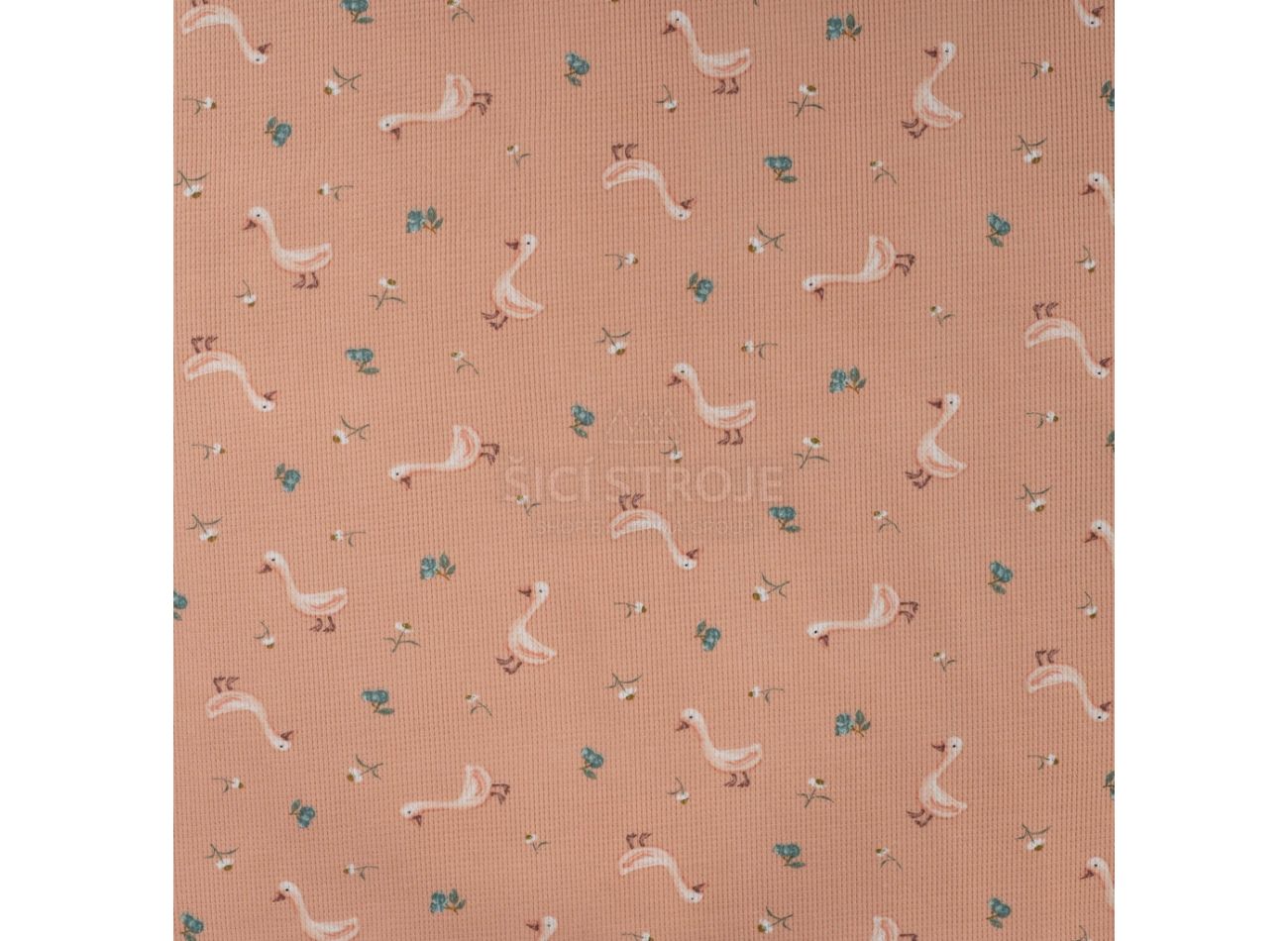 Cutie Waffle Print, 95% bavlna, 5% elastan, minimálna šírka 130 cm, gramáž 225 g/m2, vzor goose, farba dusty salmon