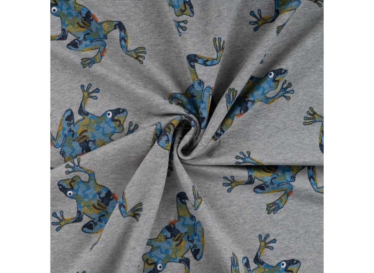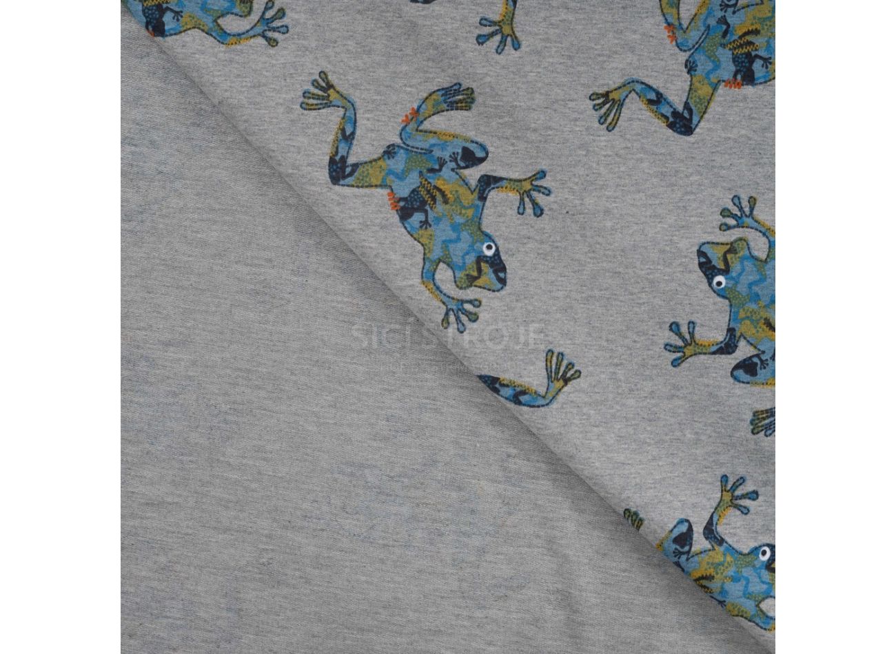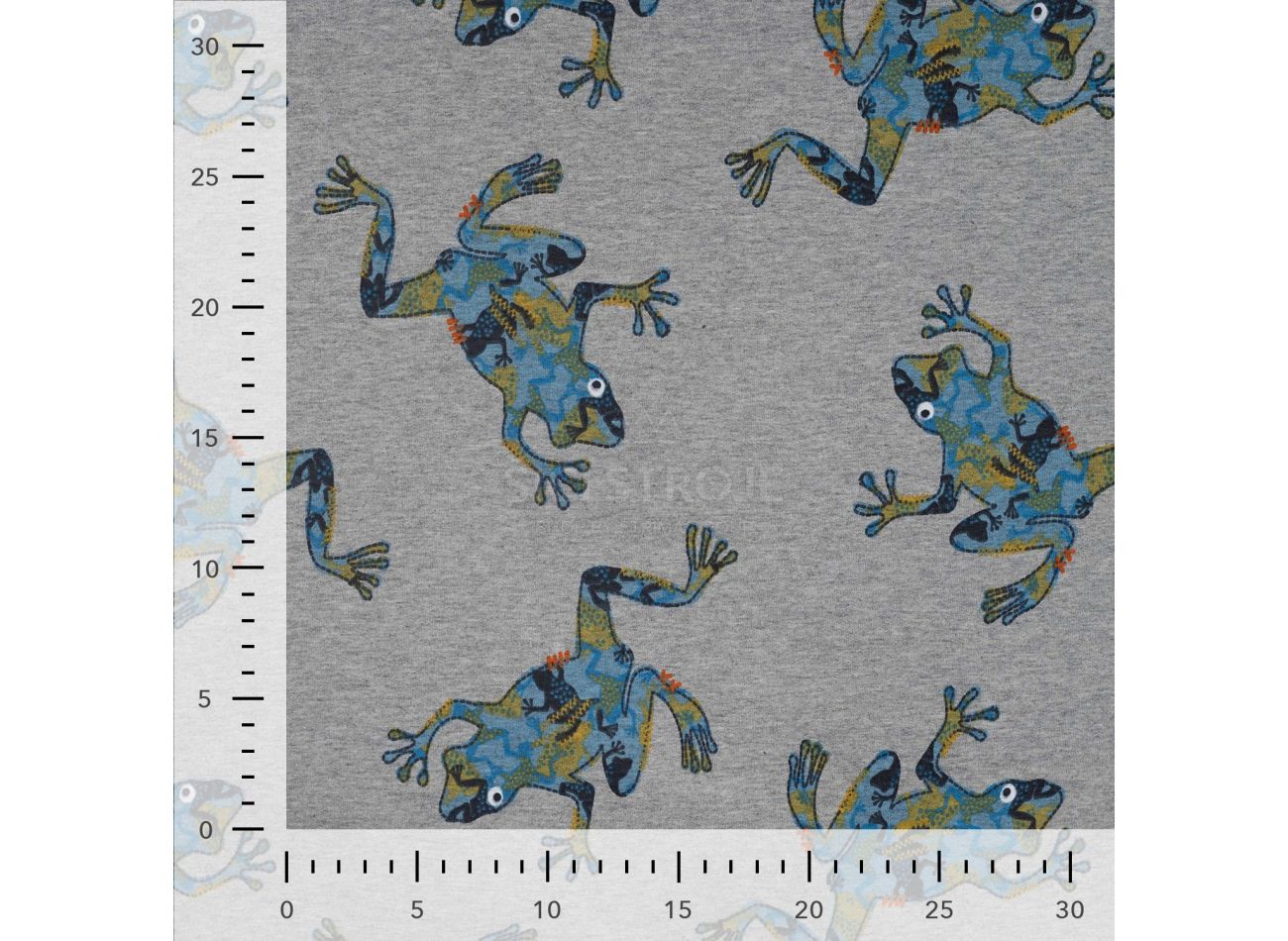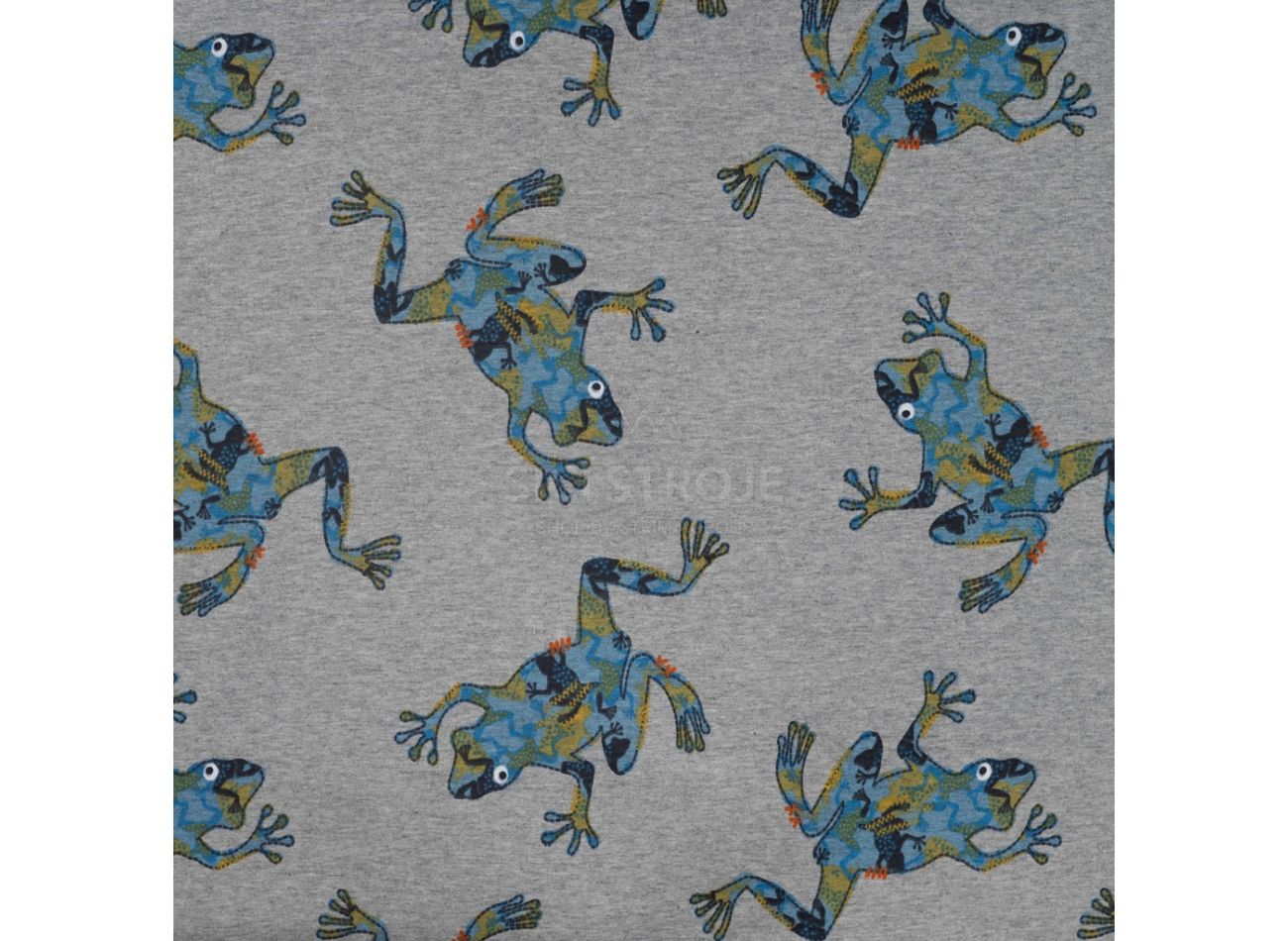 French Terry Digital Print, 95% bavlna, 5% elastan, minimálna šírka 145 cm, gramáž 230 g/m2, vzor frogs, farba light grey melange