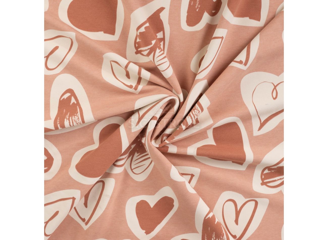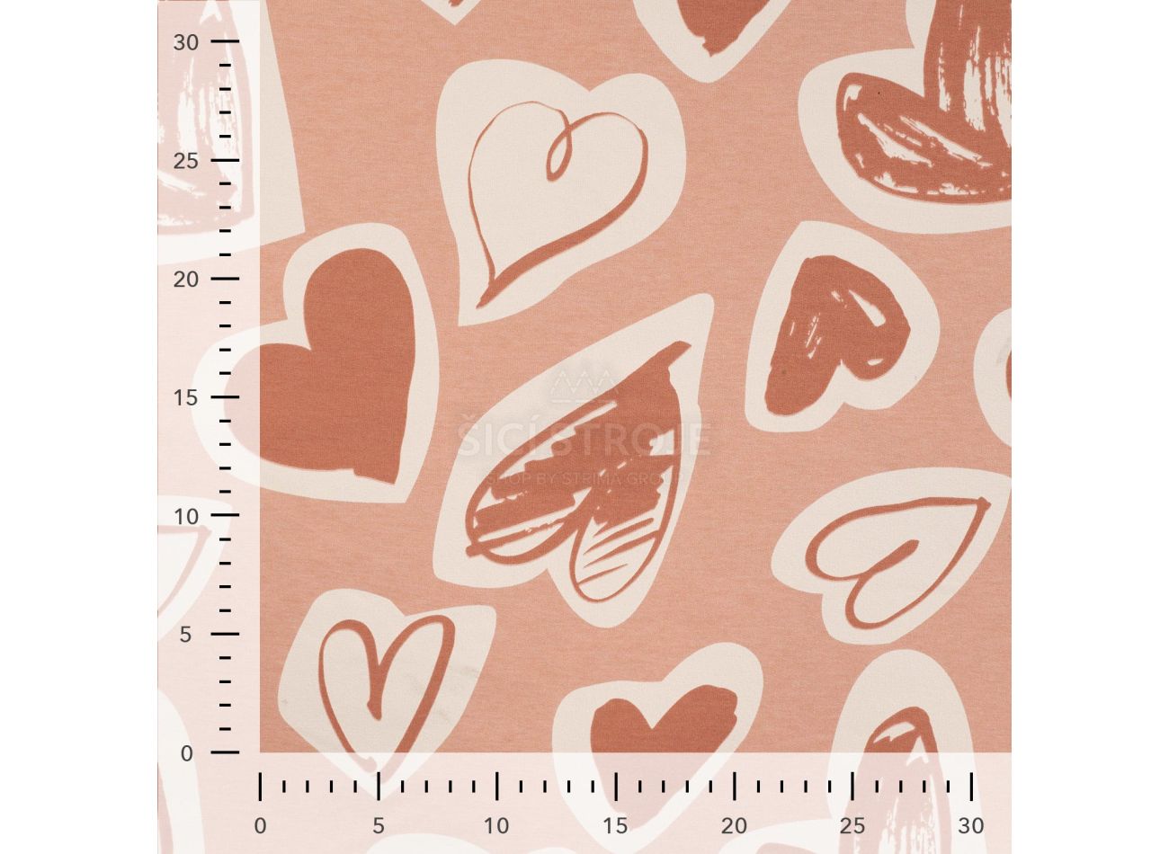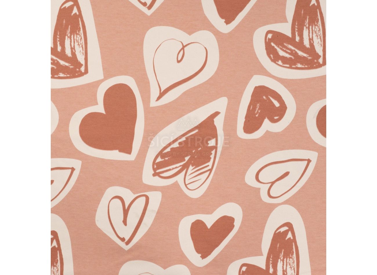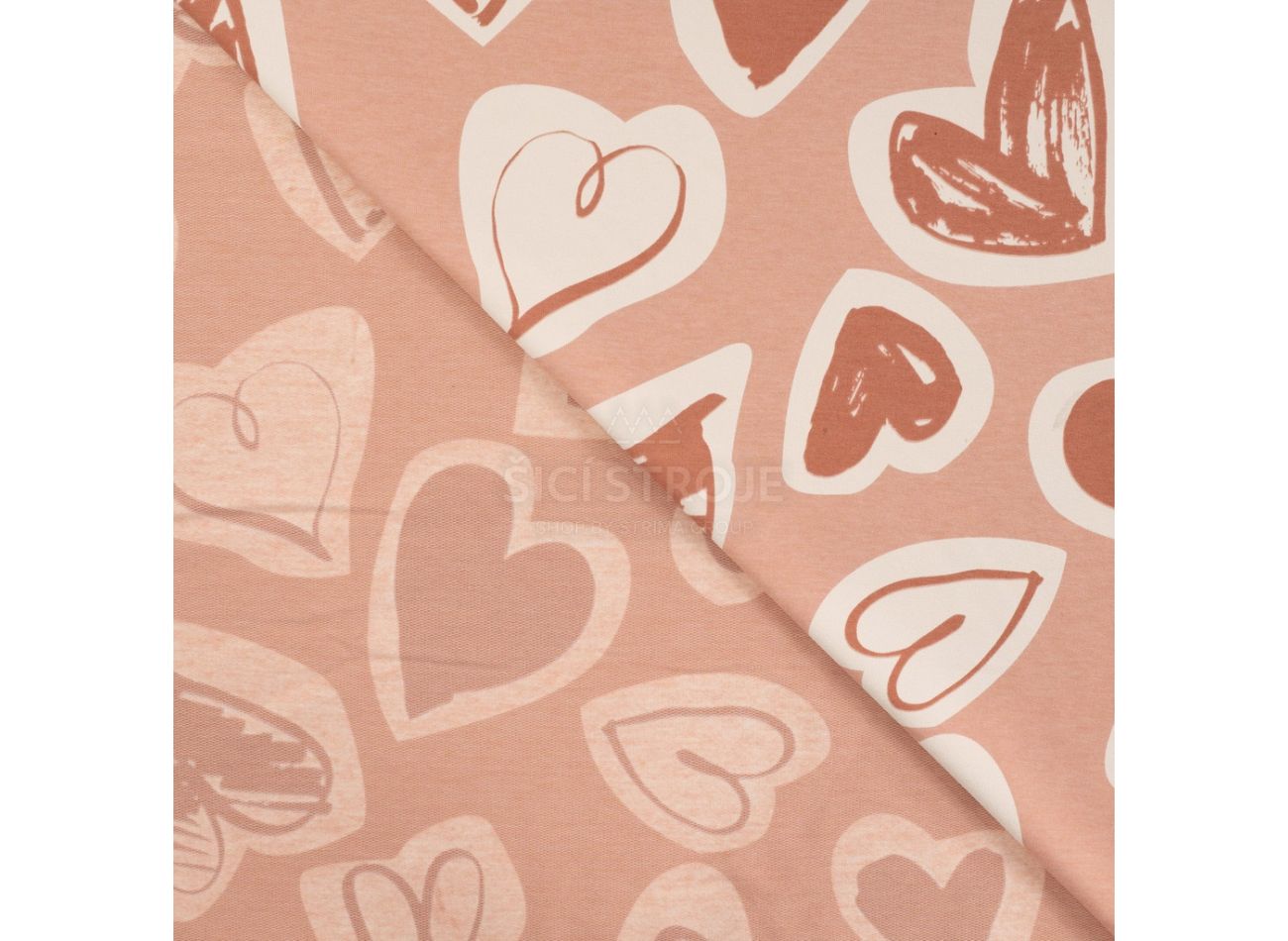 French Terry Melange Print, 55% bavlna, 40% polyester, 5% elastan, minimálna šírka 145 cm, gramáž 230 g/m2, vzor hearts, farba dusty salmon