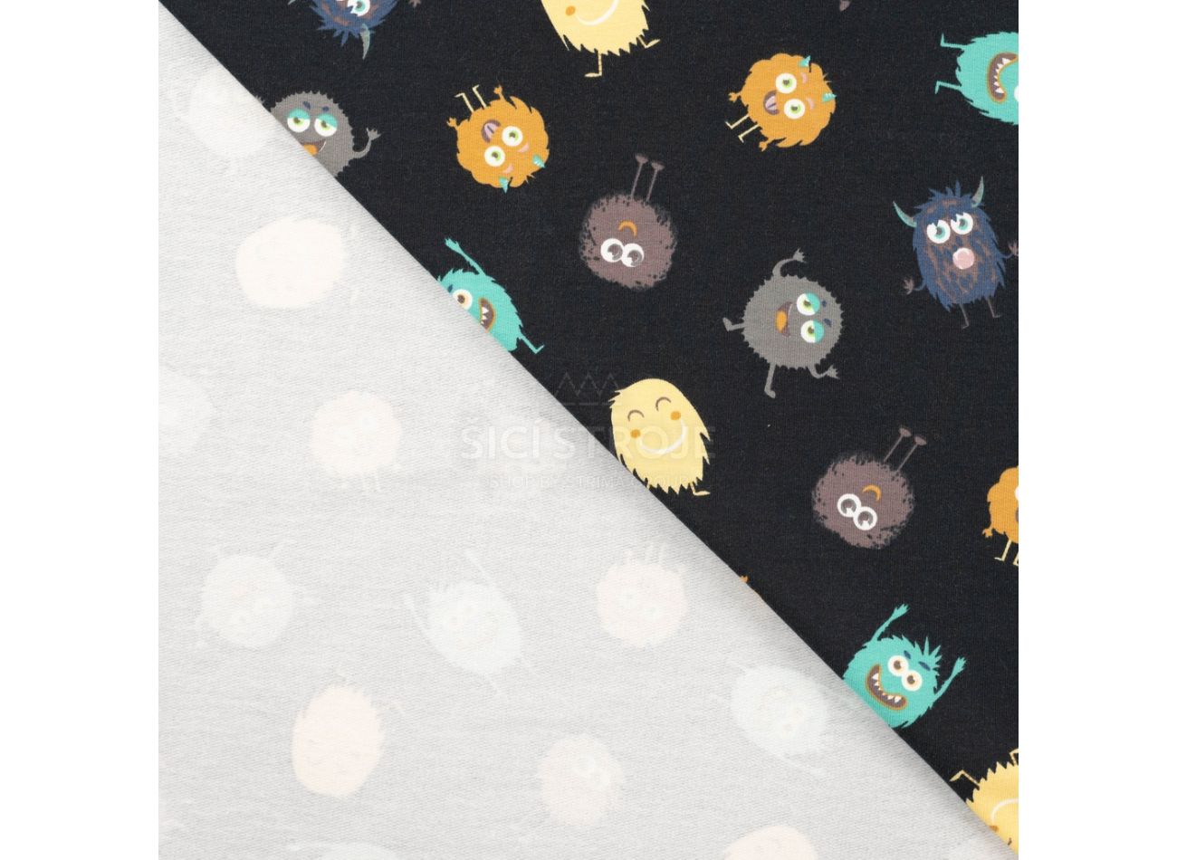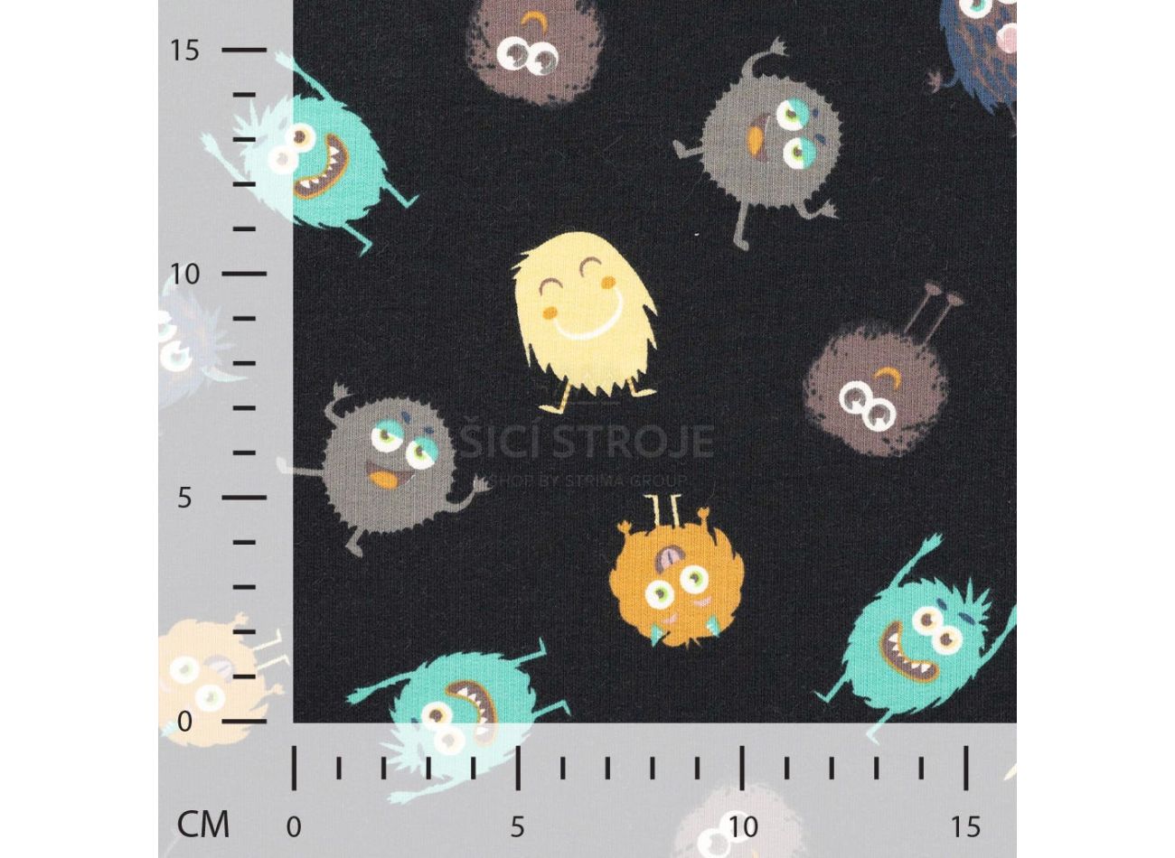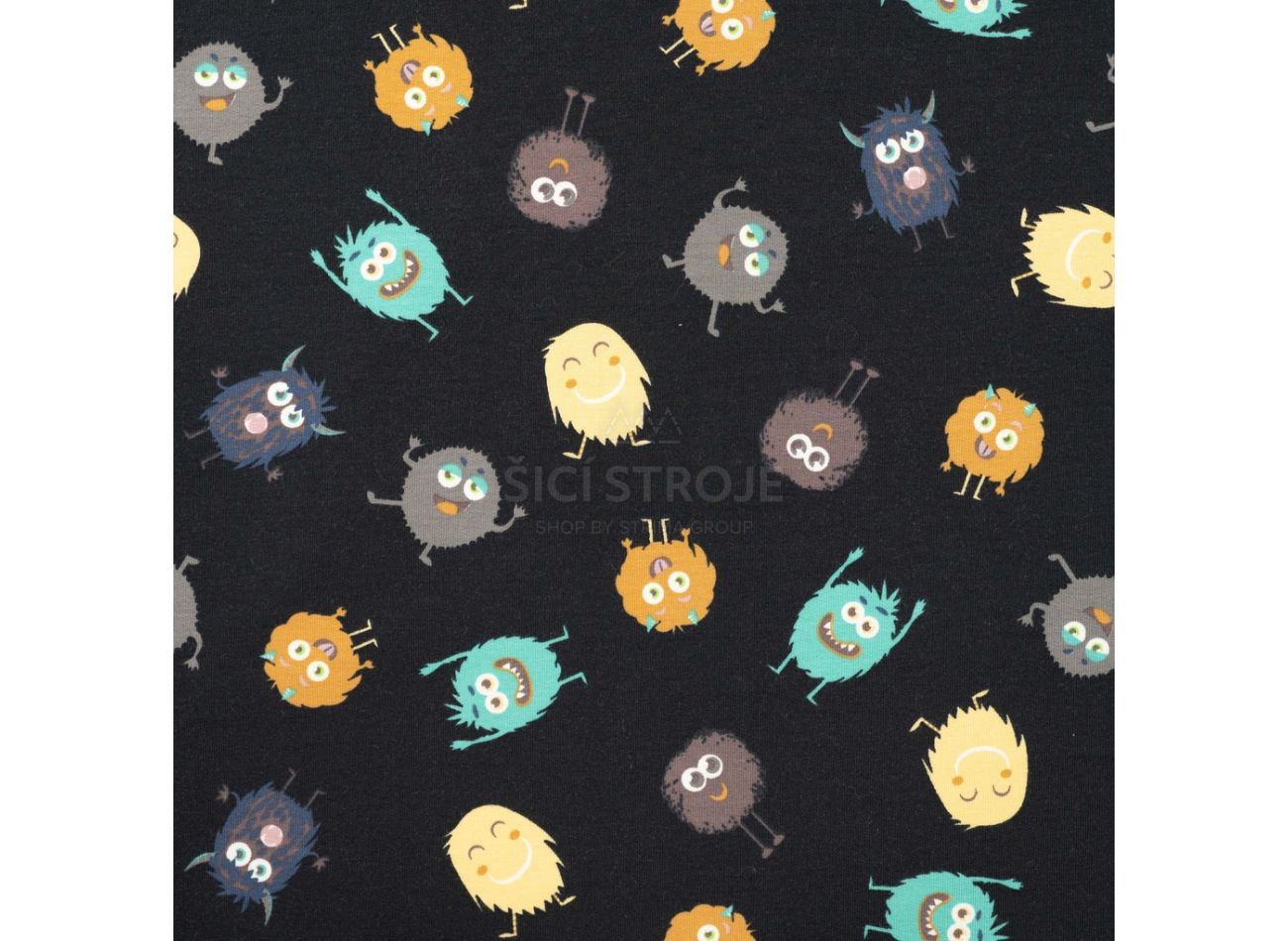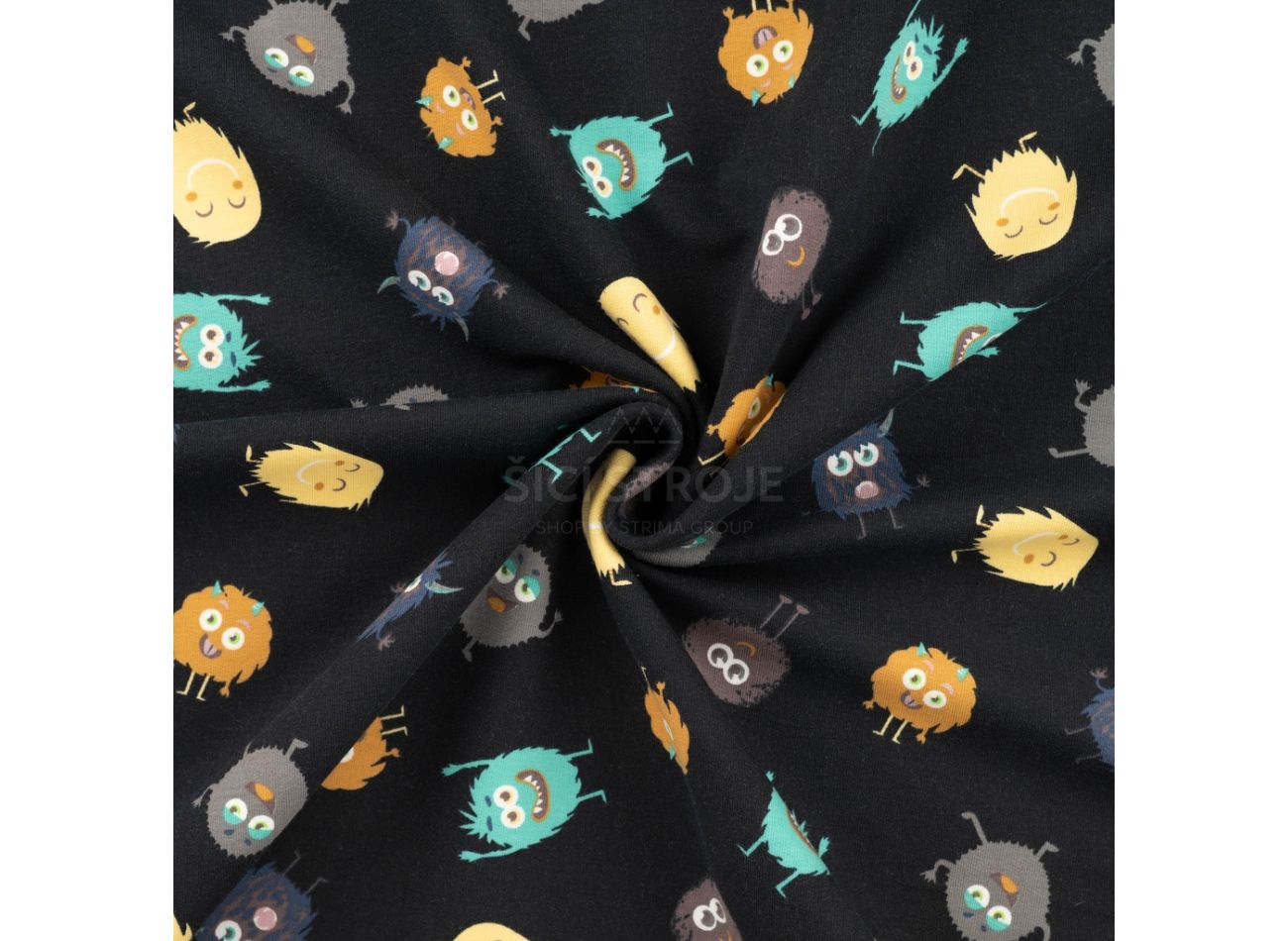 French Terry Print, 95% bavlna, 5% elastan, minimálna šírka 145 cm, gramáž 230 g/m2, vzor funny monsters, farba black