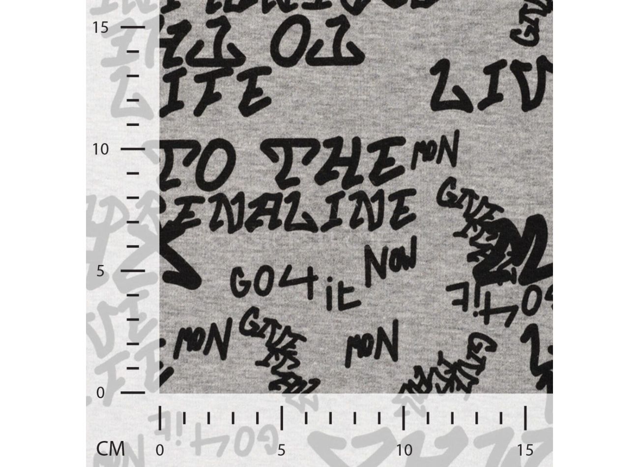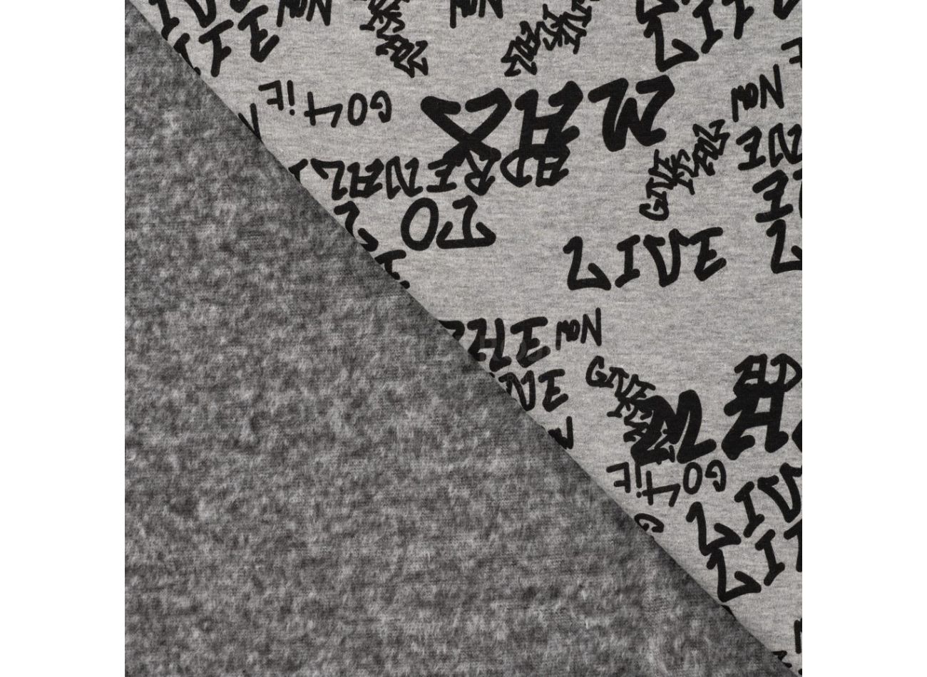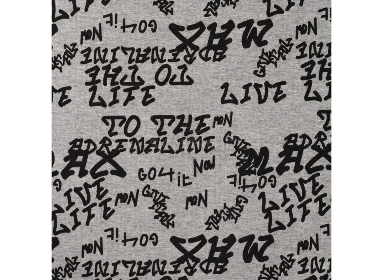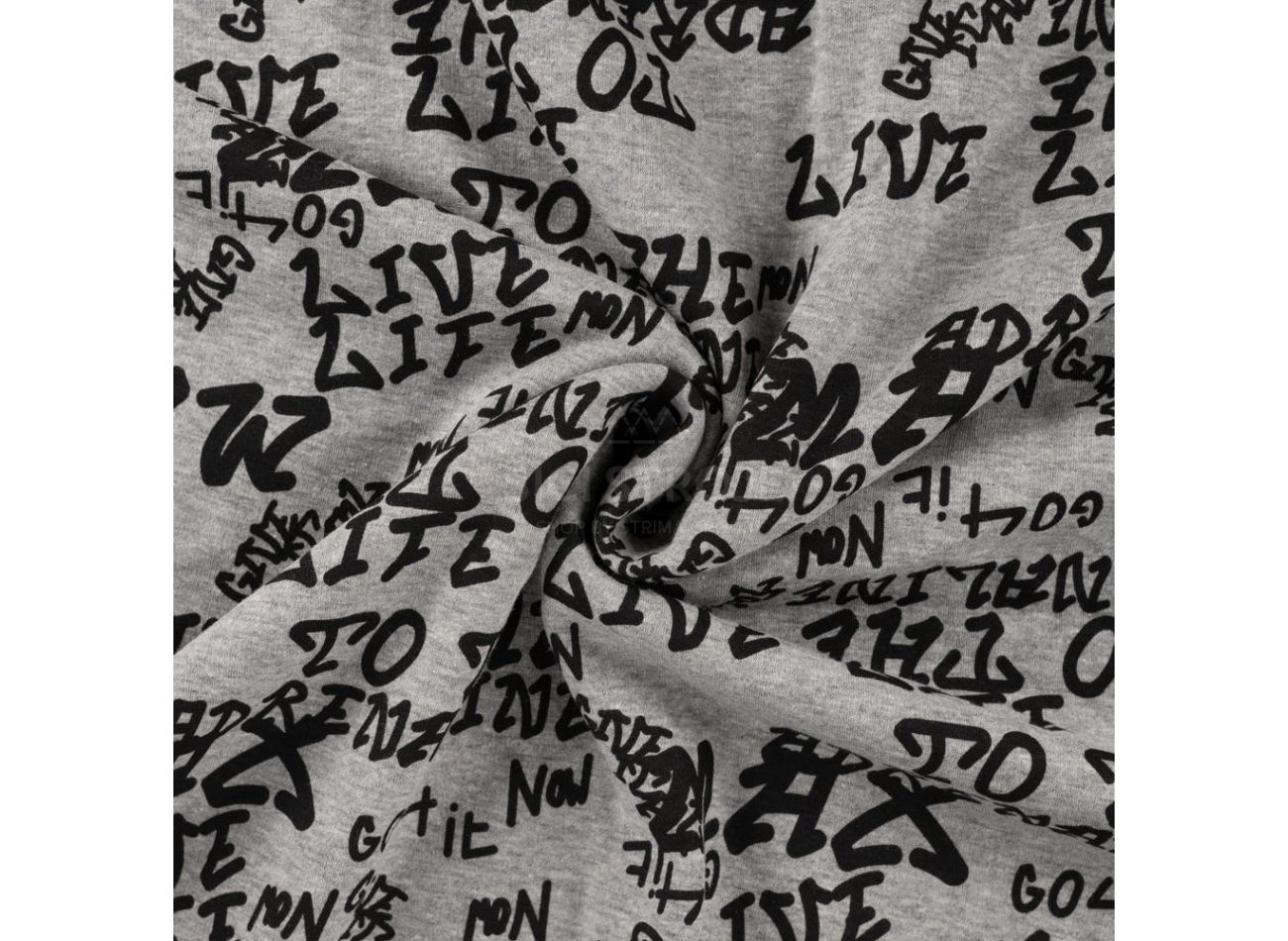 Happy Fleece Melange Print, 56% polyester, 40% bavlna, 4% elastan, minimálna šírka 145 cm, gramáž 330 g/m2, vzor text, farba light grey melange