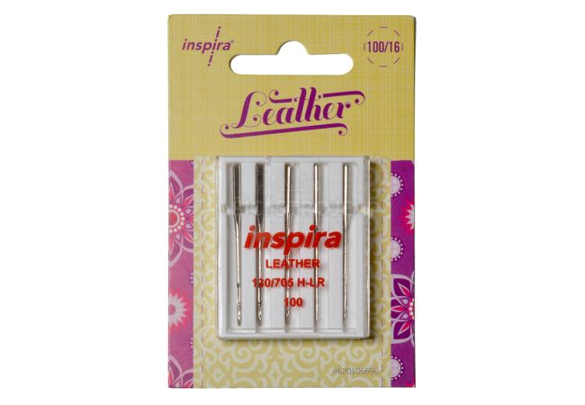 Značkové ihly Inspira na kožu pre šijacie stroje, ihla s plôškou, balenie po 5 kusoch, sila ihly je 100, značenie 130/705 H LL.