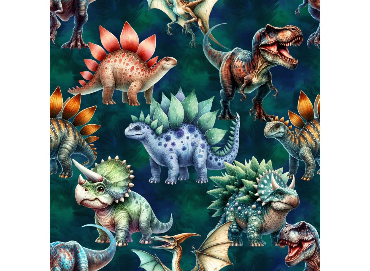 Jogging Digital Print, 70% bavlna, 30% polyester, minimálna šírka 150 cm, gramáž 280 g/m2, vzor cute dinos, farba petrol