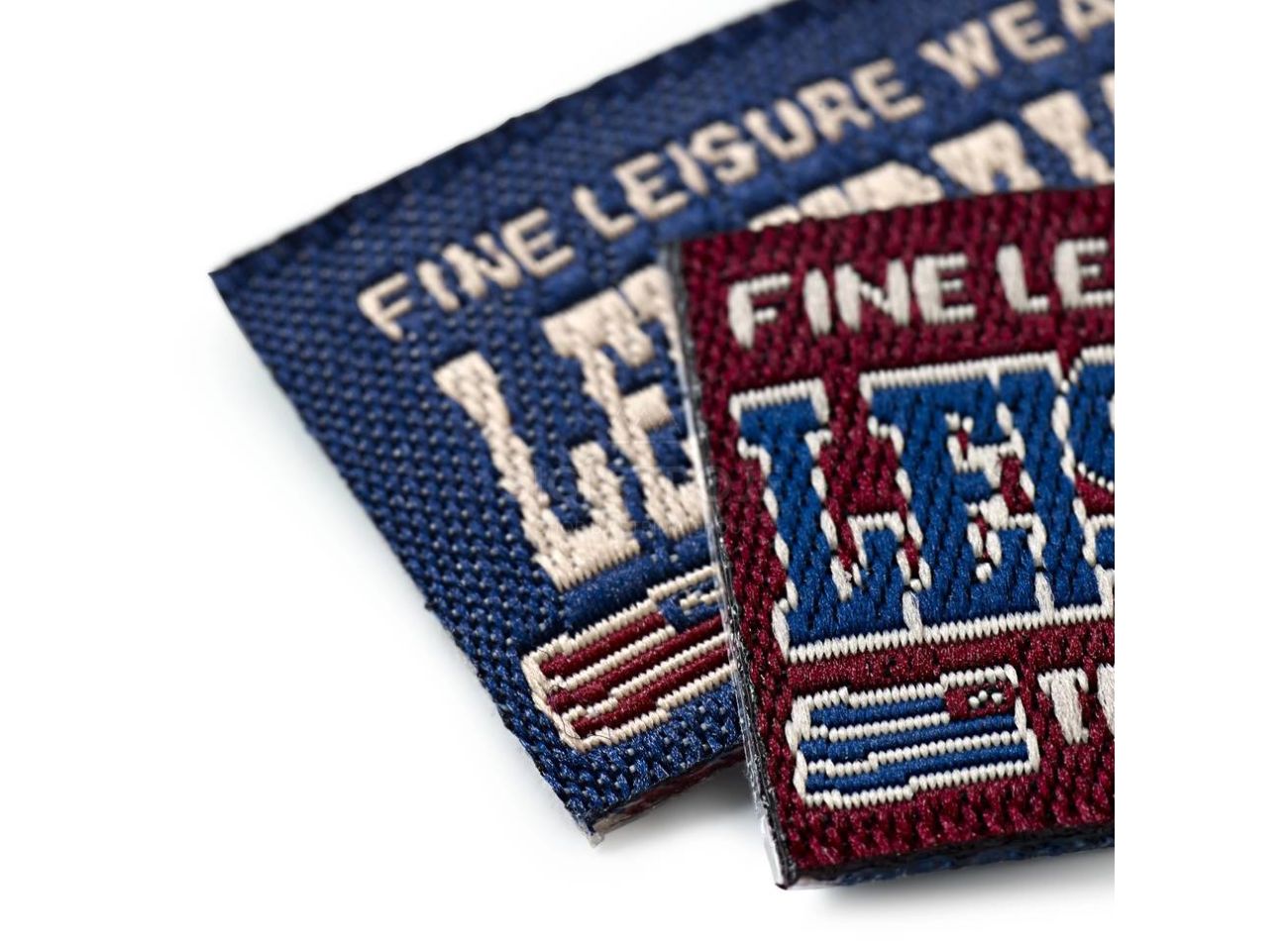Nášivka džínsový štítok Leisure Wear, nažehľovacia, modrá/červená