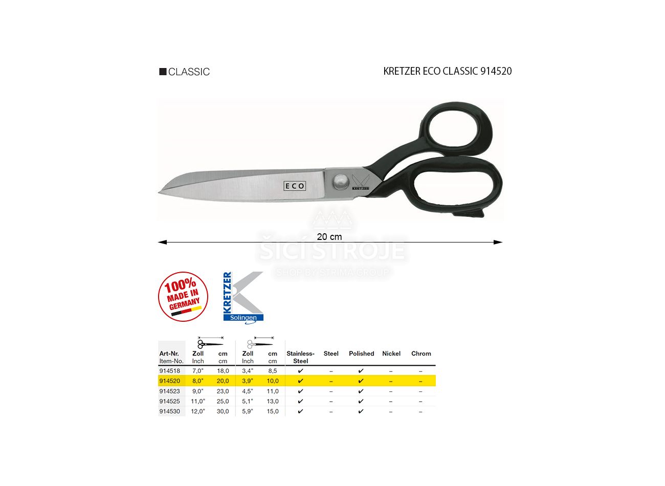 Krajčírske nožnice vhodné tiež pre precízne strihanie tých najťažších materiálov, dĺžka 8"/20 cm. Na ťažšie materiály a tkaniny. Dĺžka nožníc/čepelí: 20/10 cm, váha: 200 g, celokovové.