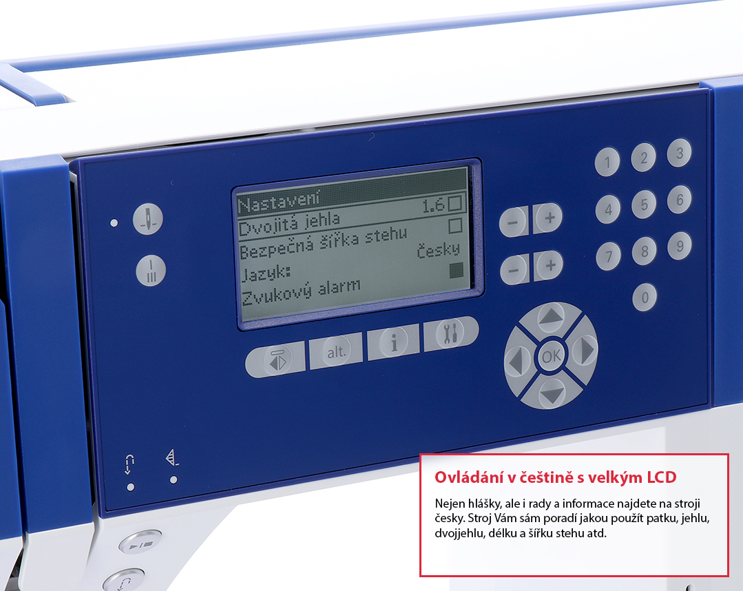 Veľký LCD displej s vysokým rozlíšením - stehy sa zobrazujú v skutočnej veľkosti, informácie o stehu a možnosti v českom jazyku.
