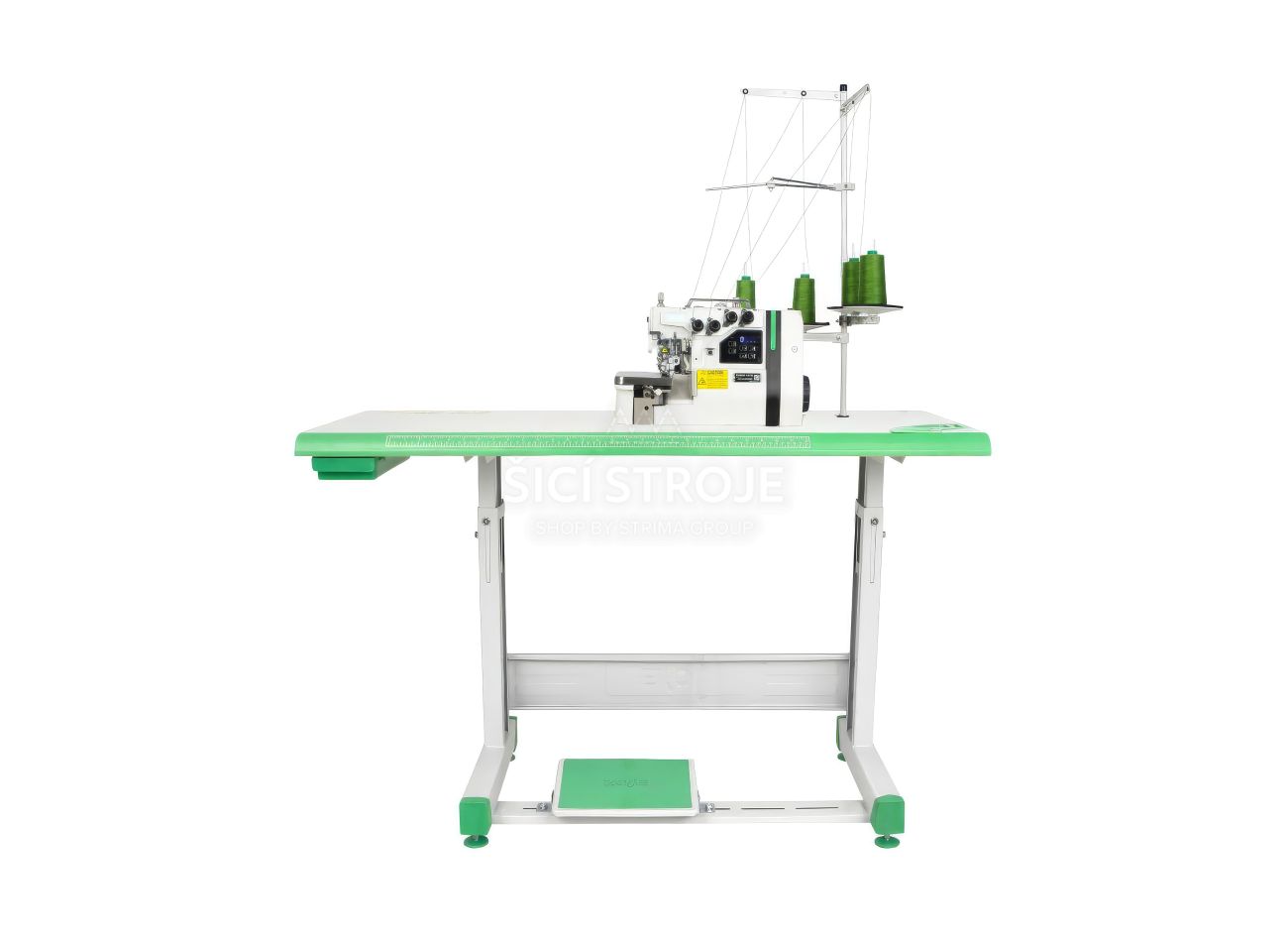 Zmontovaný, kompletný priemyselný šijací stroj vrátane podstavca so zabudovaným servomotorom s výkonom 550W (napájanie 230V), stroj je pripravený na okamžité šitie.