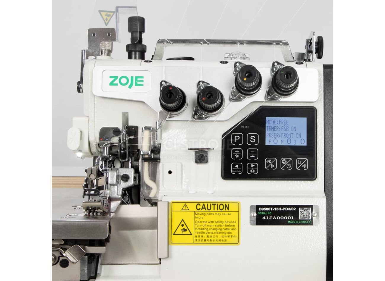 Stroj je vybavený automatickými funkciami: polohovanie ihly hore/dole, pneumatické zdvíhanie prítlačnej pätky a pneumatický odstrih nite (retiazkový steh). Tlačidlo pre rýchly retiazkový steh umožňuje aj ručné ovládanie odstrihu nite. Stroj má senzory prítomnosti látky pred a za prítlačnou pätkou a tiež bezpečnostný senzor vedľa noža. Stroj je vybavený praktickým systémom odsávania odpadu. Pracovný priestor je osvetlený LED svetlom. Energeticky úsporný servomotor AC s výkonom 550 W zabudovaný v hlave zaisťuje tichú prevádzku bez nežiaducich vibrácií.