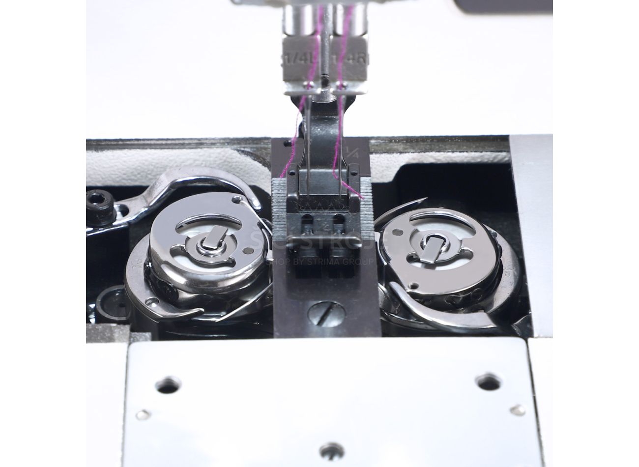 Priemyselný 2-ihlový šijací stroj s viazaným stehom a ihlovým podávaním pre ľahké a stredné materiály.