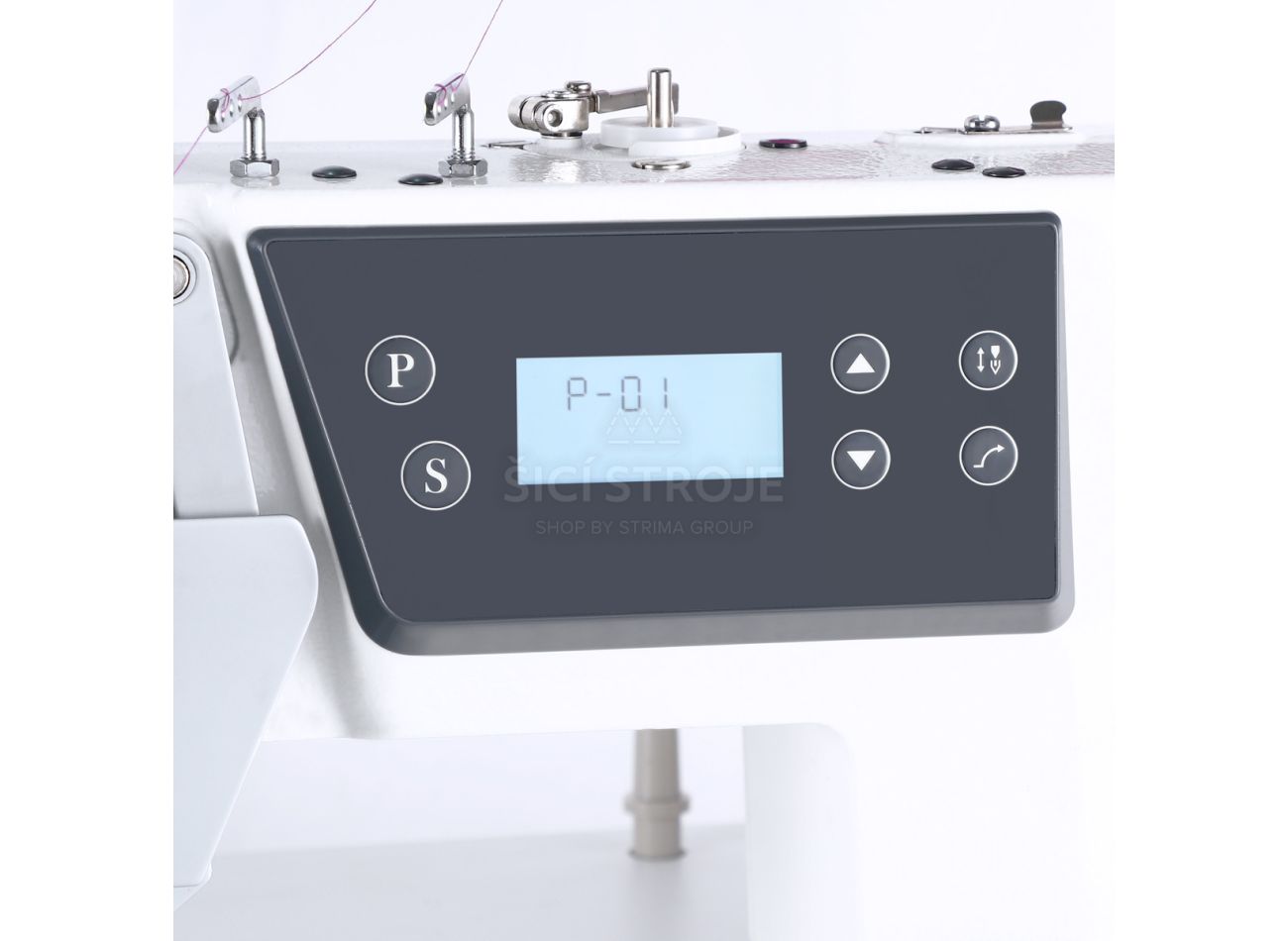 Maximální rychlost šití: 3000 stehů/min, maximální délka stehu: 5 mm a rozteč stehu: 255 mm. Spodní podávání + jehelní podávání. Chapač 21 mm. Mazání: centrální, otevřený okruh. Výška zdvihu přítlačné patky: 7-10 mm.