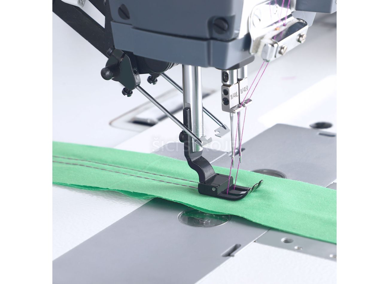 Priemyselný 2-ihlový šijací stroj s viazaným stehom a ihlovým podávaním pre stredné a ťažké materiály.
