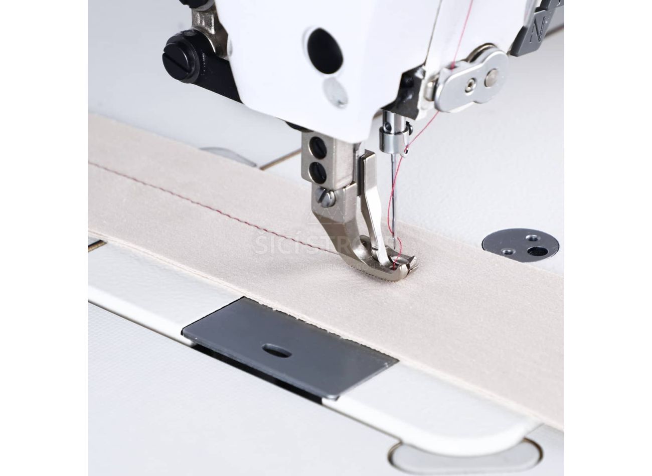 Priemyselný šijací stroj s viazaným stehom na čalúnenie a kožu.