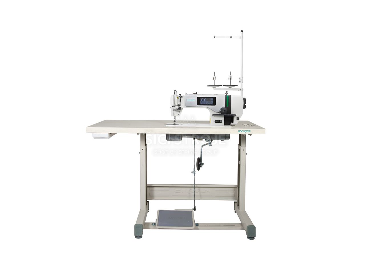 Zmontovaný kompletný priemyselný šijací stroj s veľkým chapačom (priemer cievky 26 mm), dĺžkou stehu 7 mm a automatickým odstrihom vrátane originálneho stola Zoje so zabudovaným servomotorom a panelom v hlave stroja.