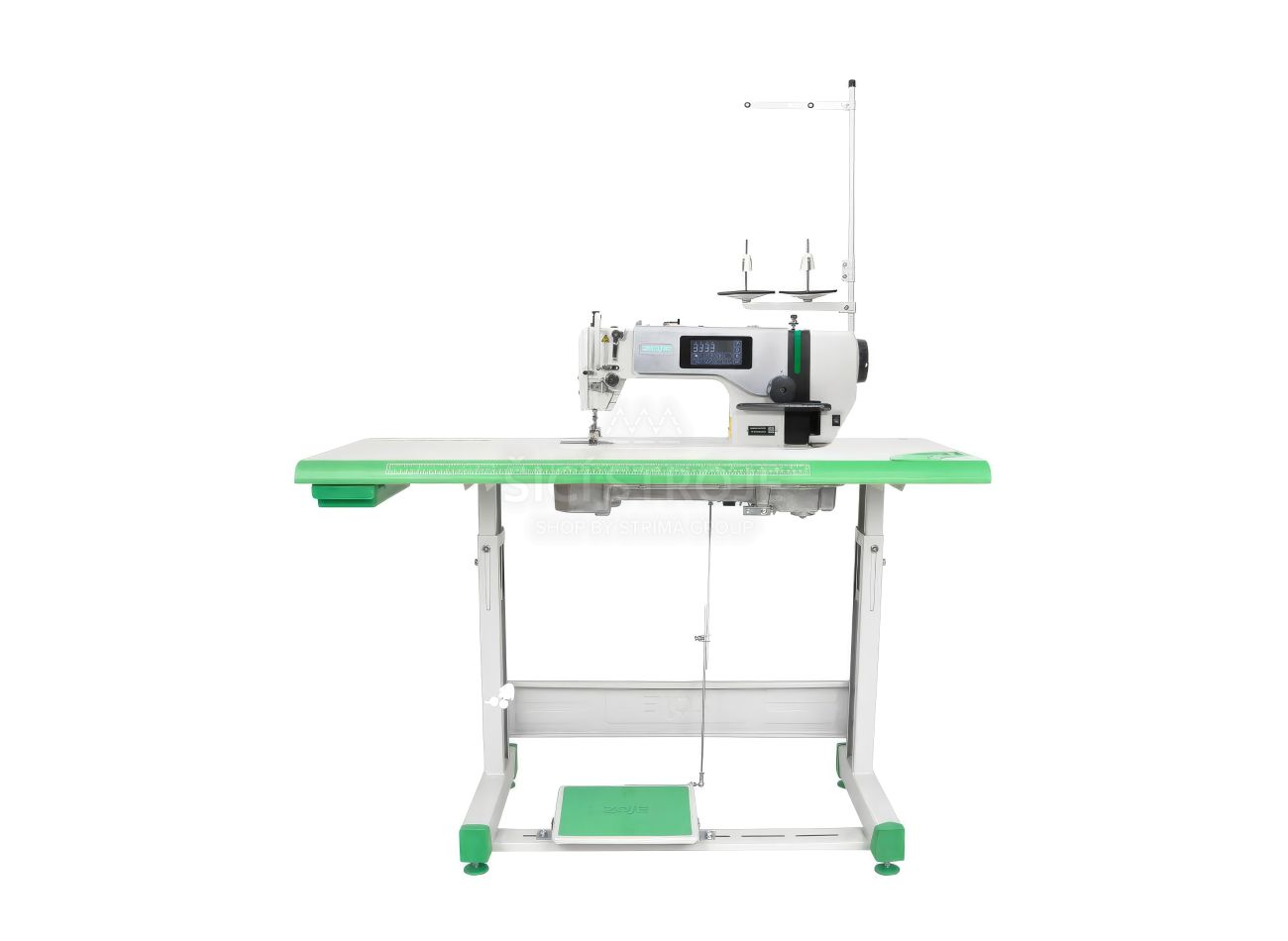 Zmontovaný, kompletný priemyselný šijací stroj vrátane podstavca so zabudovaným servomotorom s výkonom 550W (napájanie 230V), stroj je pripravený na okamžité šitie.