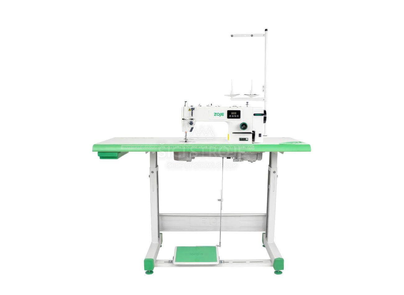 Zoje 1-ihlový šijací stroj s viazaným stehom pre ľahký a stredný materiál, servomotorom a ovládaním pomocou LED displeja, pozícia ihly - kompletný.