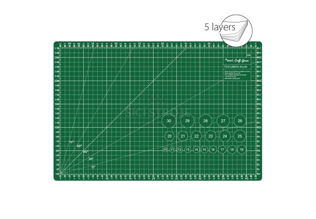 Obojstranná rezacia podložka s vyznačenými uhlami a rovnobežnými čiarami, značenie v cm/inch, hrúbka podložky 3 mm, veľkosť 45 x 30 cm - zelená.