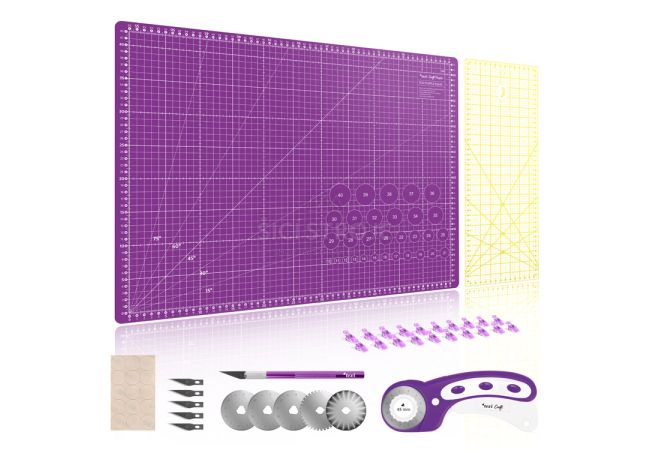 Sada rezacej podložky, rezacieho kolieska s náhradnými čepeľami, skalpelu s náhradnými čepeľami, pravítka, kolíkov a protišmykových samolepiek - fialová.