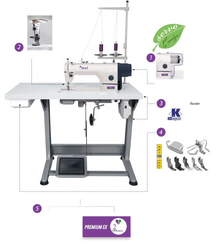 Všetky stroje Texi sú už so servomotormi. Úplne zámerne sme úplne ukončili distribúciu spojkových motorov, ktoré sú hlučné, majú vysokú energetickú náročnosť a ich oprava, alebo demontáž je veľmi prácna. Stroje Texi majú zabudované servomotory v hlave alebo majú malé servomotory Texi Power na miesto spojkových motorov. Nielen, že znížite energetickú náročnosť až o 70%, ale hlavne môžete tieto motory používať aj v domácnosti, alebo na dielni znateľne znížite hlučnosť, čo má vplyv aj na pracovné prostredie. Motory sa neprehrievajú, takže nemusíte riešiť vysoké teploty v dielňach a môžete si dovoliť na menší priestor dať viac strojov. Ďalšou nespornou výhodou je, že aj pri základných modeloch ponúkame pozicionér už v cene, za ktorý inde platíte. Sami uznáte, že možnosť nastavenia pozície ihly hore alebo dole automaticky je úžasná a nie je už len doménou drahých strojov s odstrihom.