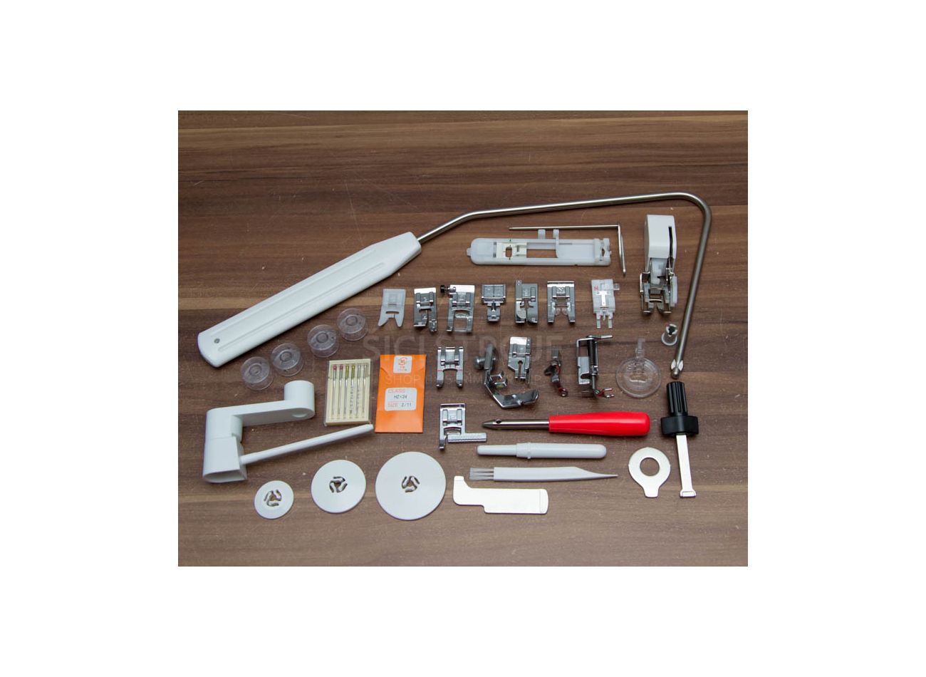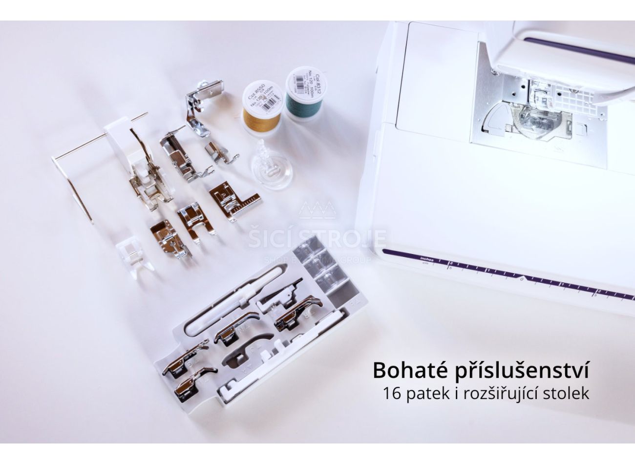 V základnom vybavení má rozširujúci stolík, kolennú páku a celkom 16 pätiek na šitie odevov, patchworku aj bytových dekorácií. S kolennou pákou a automatickým odstrihom nite sa vám budú skvele šiť kabelky.