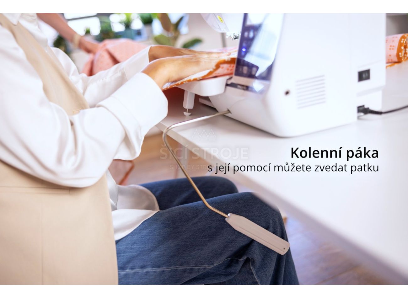 Keby ste nechceli zdvíhať pätku funkciou PIVOT, máte k dispozícii ešte tlačidlo zdvihu pätky na hlave stroja, klasickú ručnú páčku a tiež kolennú páku.