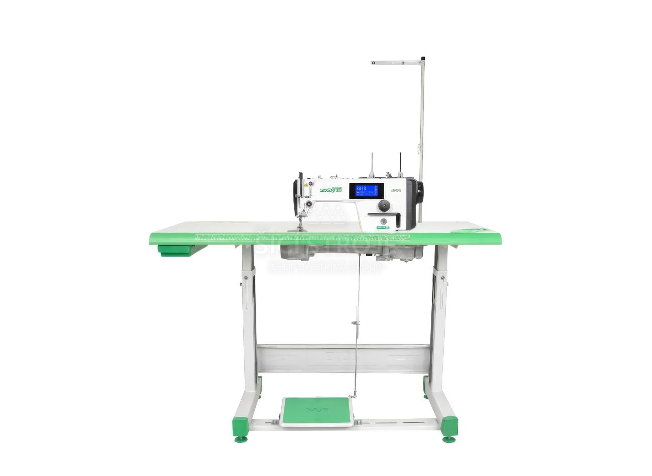 Zmontovaný kompletný priemyselný šijací stroj s automatickým odstrihom vrátane originálneho stola Zoje so zabudovaným servomotorom a panelom v hlave stroja. Novinka - moderný typ mazania zabraňujúci poškodeniu materiálu - suchá ihla.