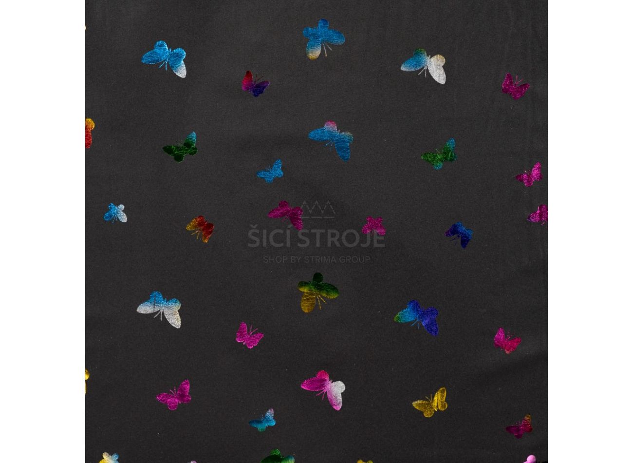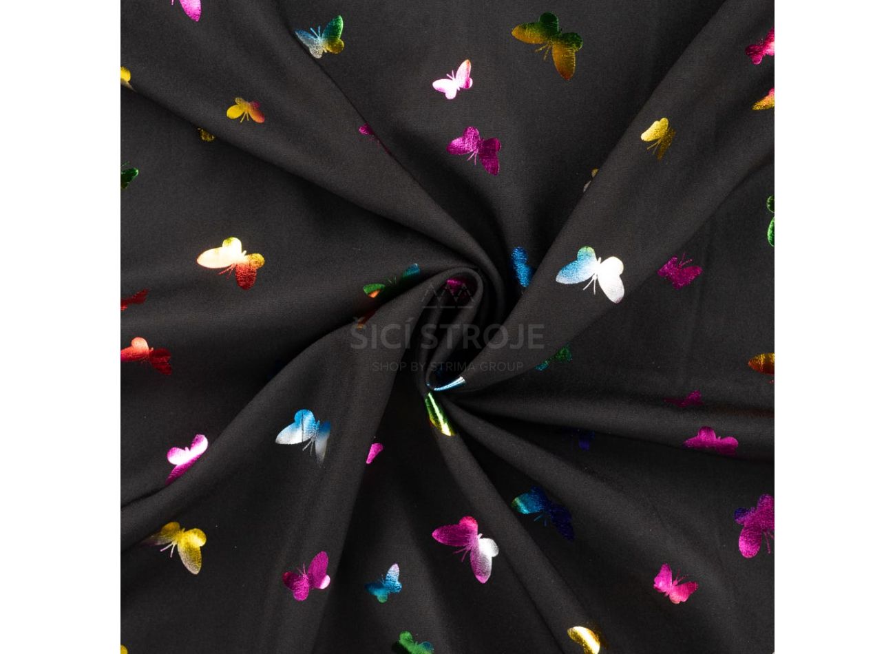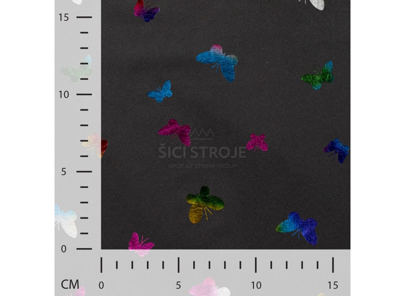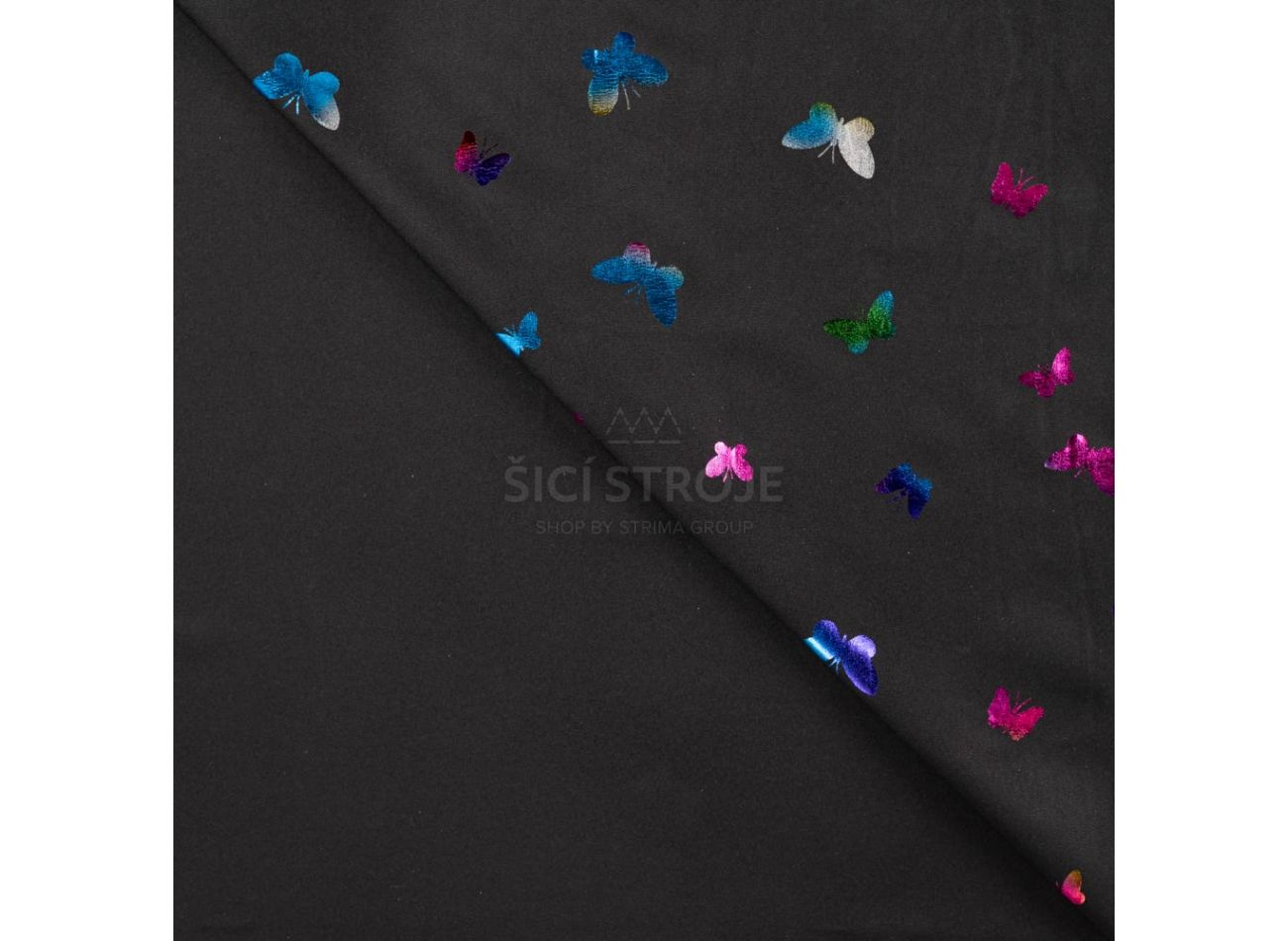 Soft Shell Foil Print, 99% polyester, 1% elastan, minimálna šírka 145 cm, gramáž 310 g/m2, vzor butterflies, farba black multi foil