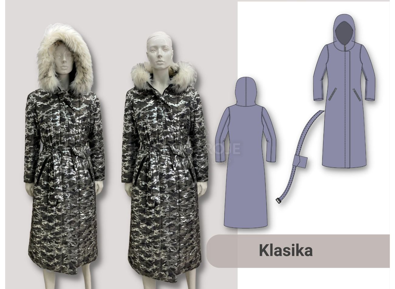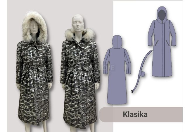 Kabát Bela má mierne priliehavú líniu, dvojdielny tvarovaný hlavicový rukáv, dve vrecká na zips a priestrannú kapucňu, ktorá neodstáva. Ku kabátu je opasok s praktickým vreckom.