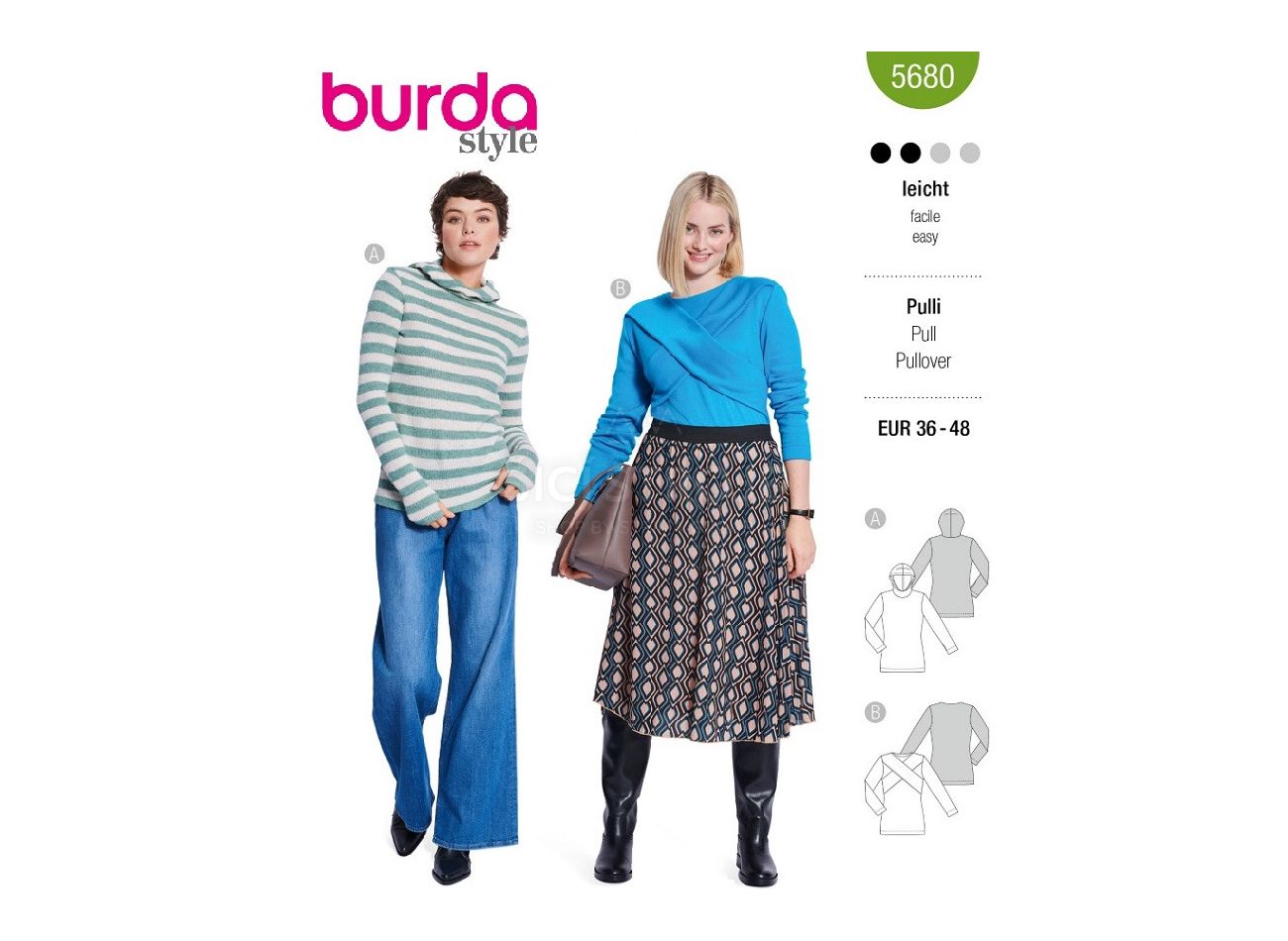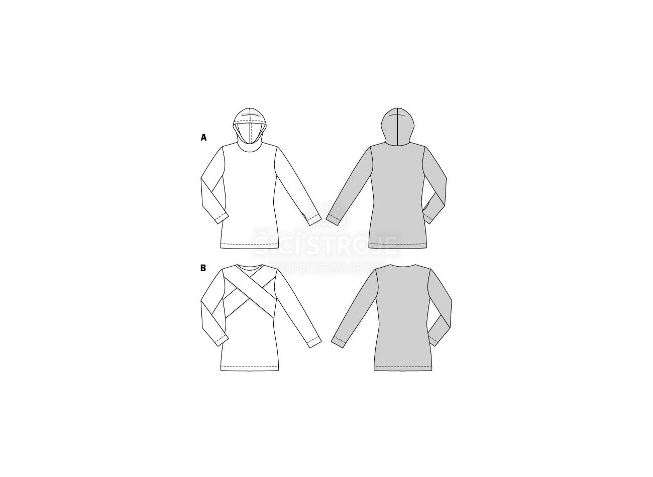 Strih Burda 5680 - Mikina s kapucňou, pletený upnutý top s prekrížením