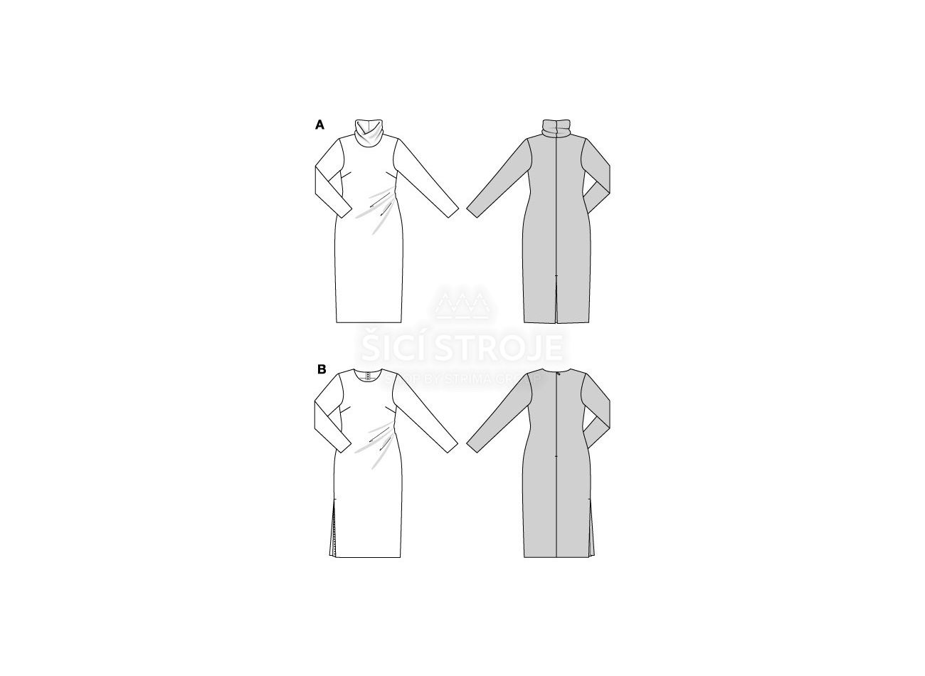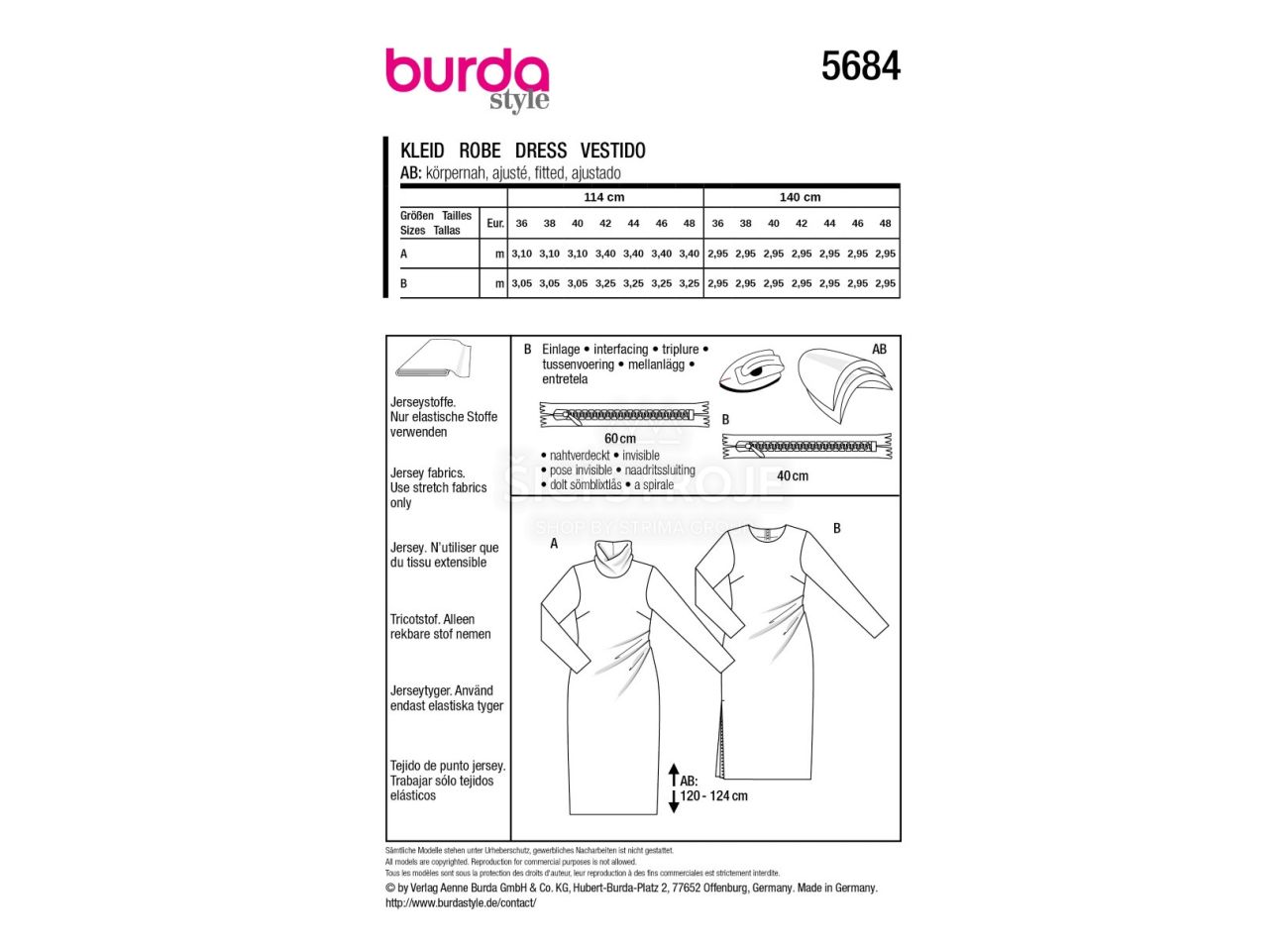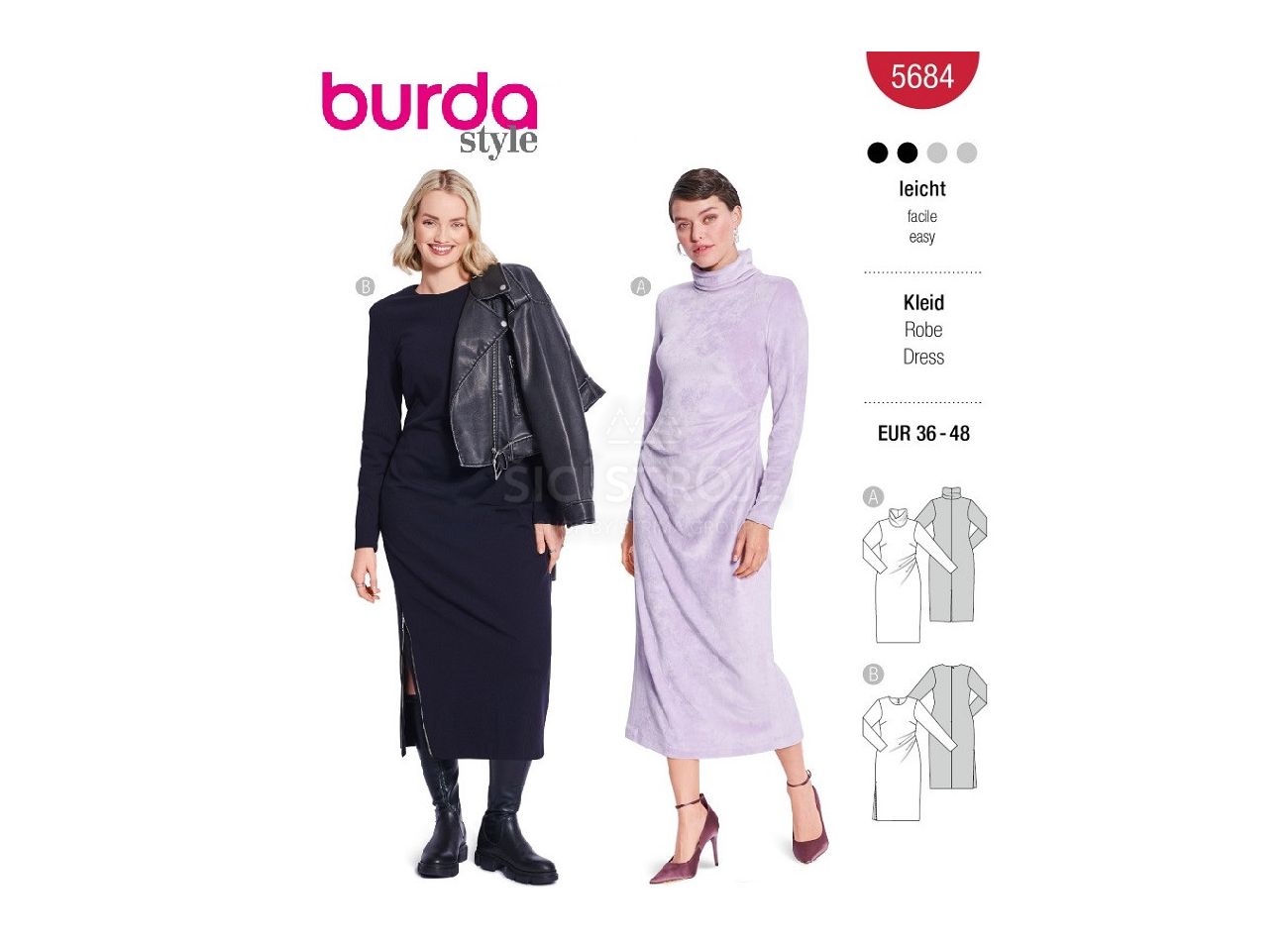 Strih Burda 5684 - Úzke rolákové šaty, midi šaty s asymetrickým riasením