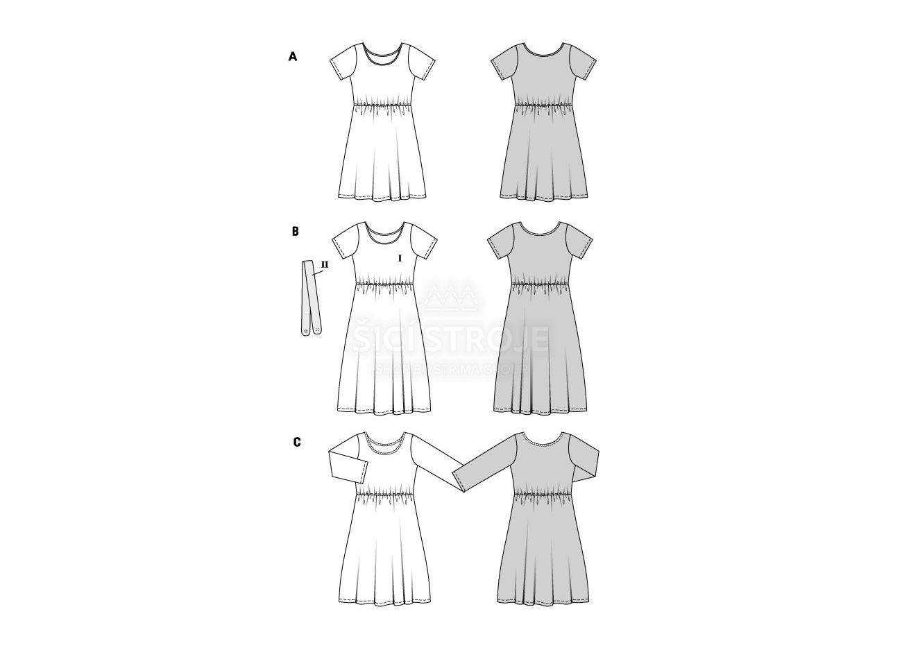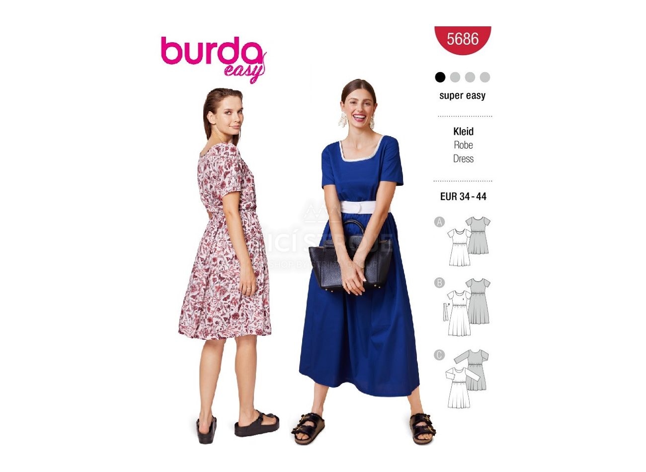 Strih Burda 5686 - Šaty s gumičkou v páse, midi šaty s rozšírenou sukňou