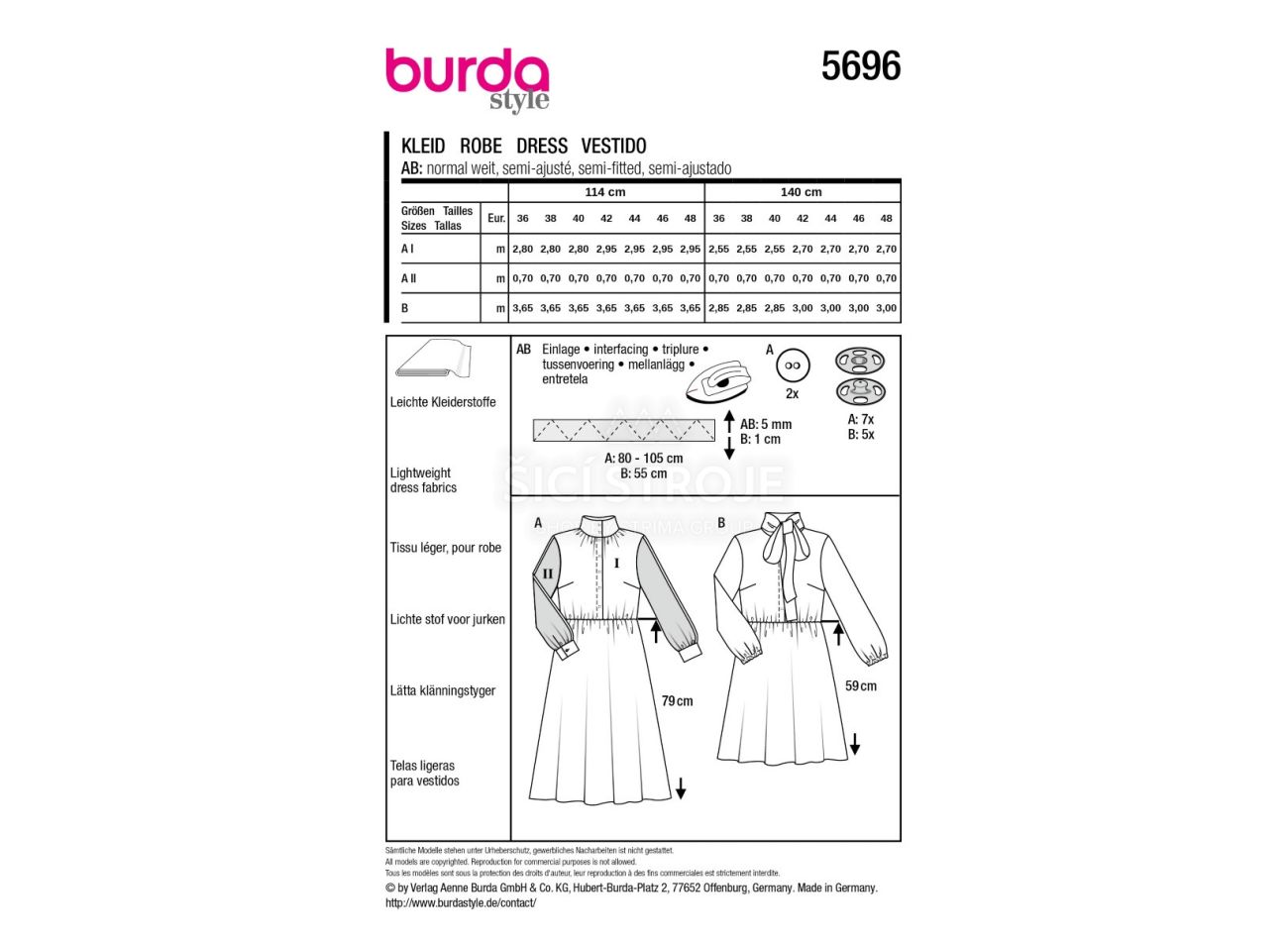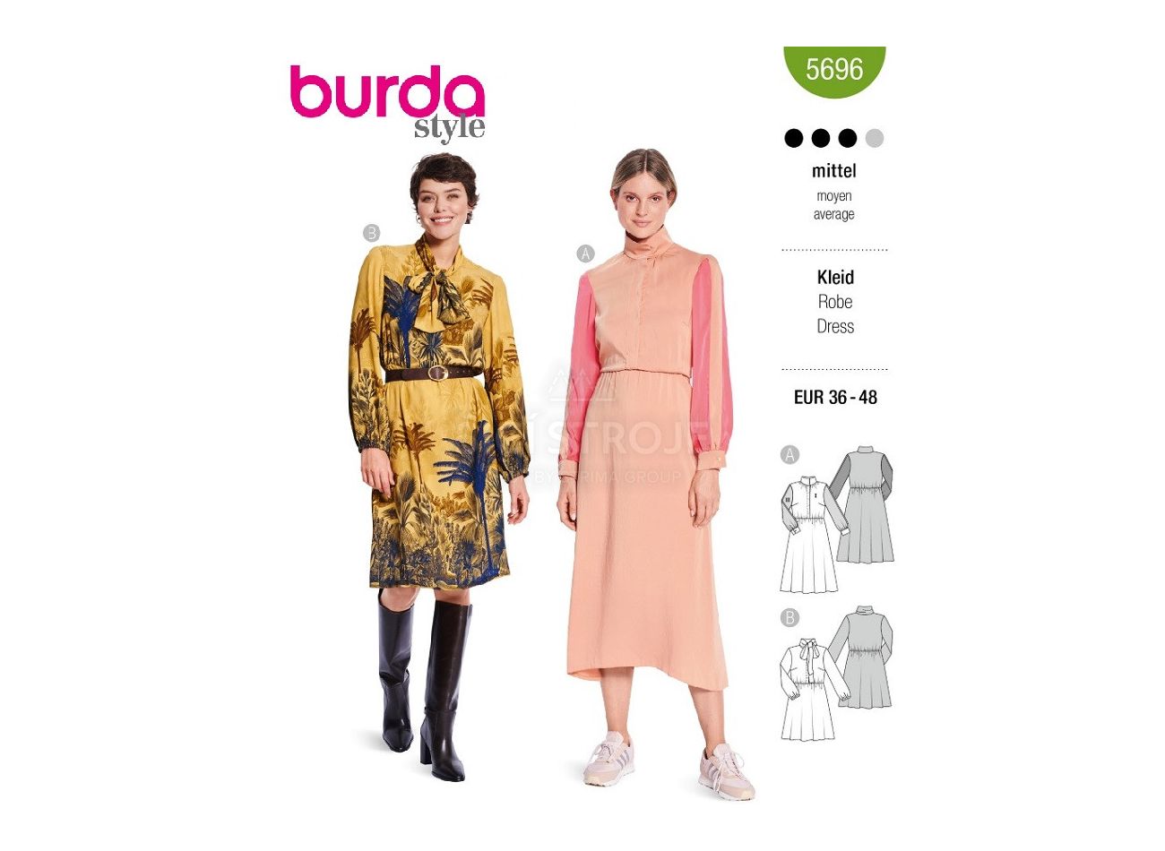 Strih Burda 5696 - Šaty s vysokým golierom, šaty s gumou v páse